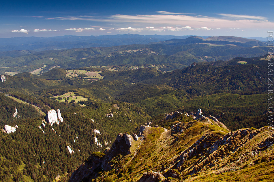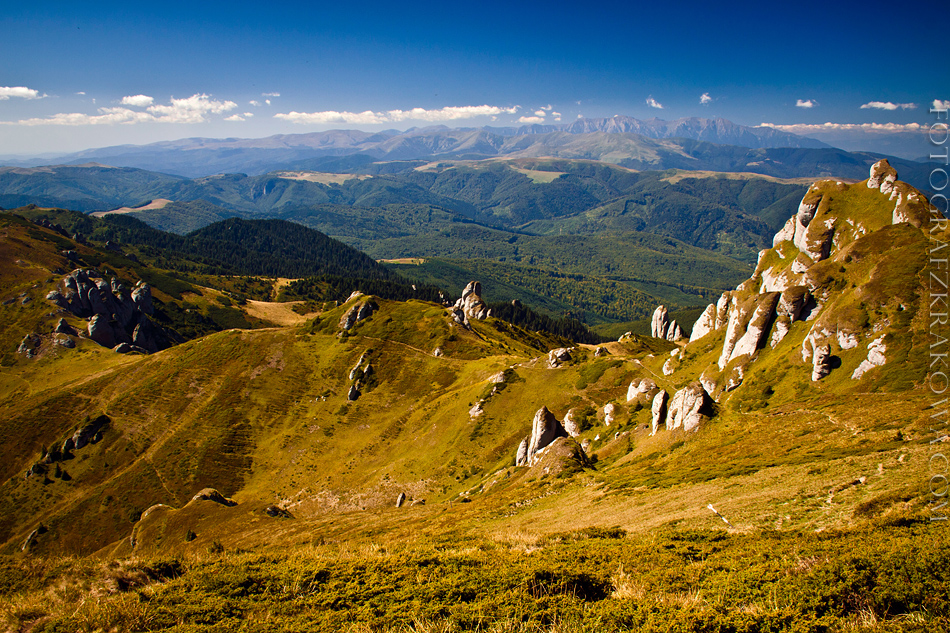 We wrześniu odbyłem tygodniowy trip po Rumunii. Wraz z grupką przyjaciół zwiedziliśmy kilka pasm górskich, mnóstwo zabytków oraz piękne miasta. Jechaliśmy samochodem wypchanym bagażami po brzegi łącznie z namiotami, kociołkami do gotowania, karimatami, jedzeniem na tydzień, sprzętem fotograficznym etc… Dlatego wyprawa była totalnie po kosztach:) Trasa ułożona była po środkowej Rumunii, ale zatrzymaliśmy się też na Węgrzech i Słowacji. Po nocnym zwiedzaniu Koszyc, zobaczyliśmy piękny, ogromny skalny wąwóz Turda u stóp gór Trascau. Następnego dnia zobaczyliśmy miasta Medias oraz Sighisoara. W tym drugim niestety trafiliśmy na festiwal filmowy, więc wejście na starówkę było płatne! Niesamowite są kościoły warowne w Biertan i Viscri – potęga architektury i historii, gdzie czas jakby się zatrzymał. Zwiedzając Brasov mieliśmy znów pecha, gdyż odbywał się tam kolejny huczny festiwal. Na szczęście nocleg był w spokojnym miejscu u stóp gór Ciucas. Tu ruszyliśmy już pieszo grzbietem zdobywając najwyższy Varful Ciucas. Góry zaiste majestatyczne! W kolejny dzień odwiedziliśmy Sybin – piękne miasto, które śmiało porównać można do Krakowa… oraz kolejne warowne miejsca i stare zabytki, oraz piękny przełom Czerwonej Wieży z widokiem na Fogarasze. Długo zastanawialiśmy się czy jechać drogą transfogarską czy transalpiną, ale wybraliśmy tę drugą. Opłacało się, widoki niesamowite, ta przestrzeń oraz możliwość spokojnego noclegu na około 2000 m n.p.m (oczywiście w namiocie). Tutaj obudziłem się jeszcze dużo przed wschodem słońca by urządzić sobie plener fotograficzny na grzbiecie gór Parang. Kolejne góry jakie chcieliśmy zobaczyć to słynne Retezat. Dawno nie odczułem takiej dzikości w górach. Potężne, majestatyczne, wręcz przygniatające. Samochód zatrzymaliśmy w pustym po sezonie Rausor, następnie udaliśmy się na nocleg do Cabany Pietrele by następnego dnia zdobyć Vf Retezat 2482m n.p.m. Z nadziejami, że będziemy spać w Refugio Condorul, musieliśmy się udać aż do Rausor, gdyż schron zastaliśmy w ruinie. Ostatnie dwa dni przeznaczyliśmy na powrót z noclegiem jeszcze w Rumunii nieopodal granicy z Węgrami w Lipovej. Odwiedziliśmy jeszcze zamek w Hunedoarze (wejściówkę cenią sobie zbyt zacnie…) oraz cudowne romańskie cerkwie w Strei oraz Densus (ostatnie fotografie). W ostatni dzień zwiedziliśmy urokliwe węgierskie miasteczko Vacu oraz Słowacką Bańską Bystrzyce i Vlkoliniec. Ponższe fotografie pokazują rumuńską część wyprawy.