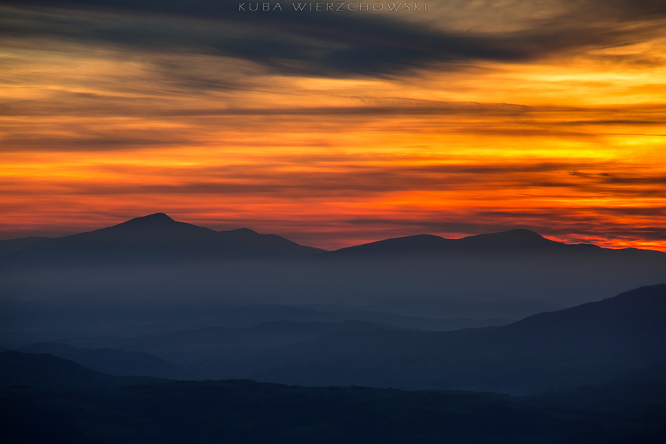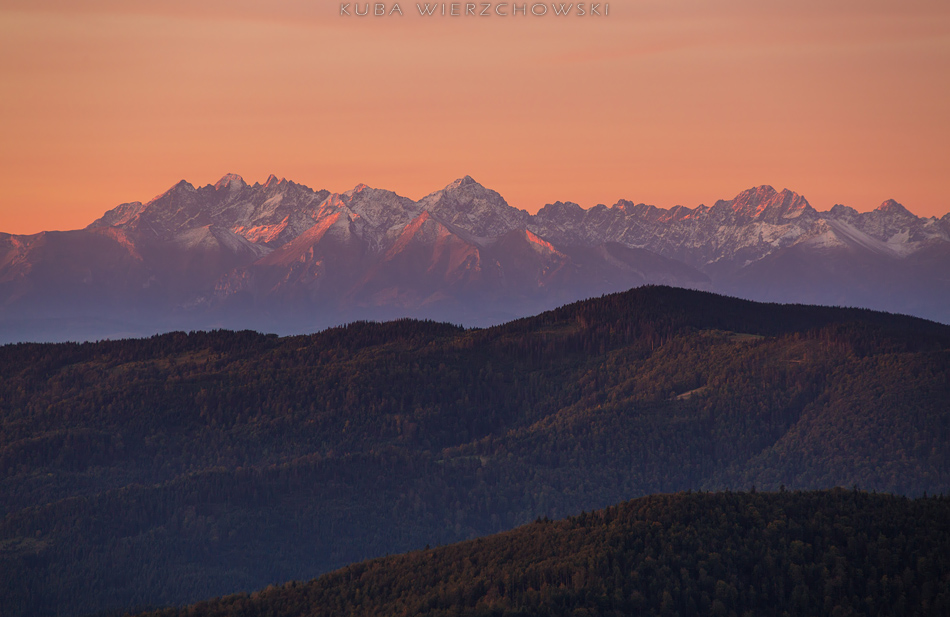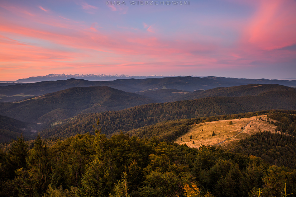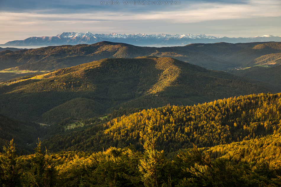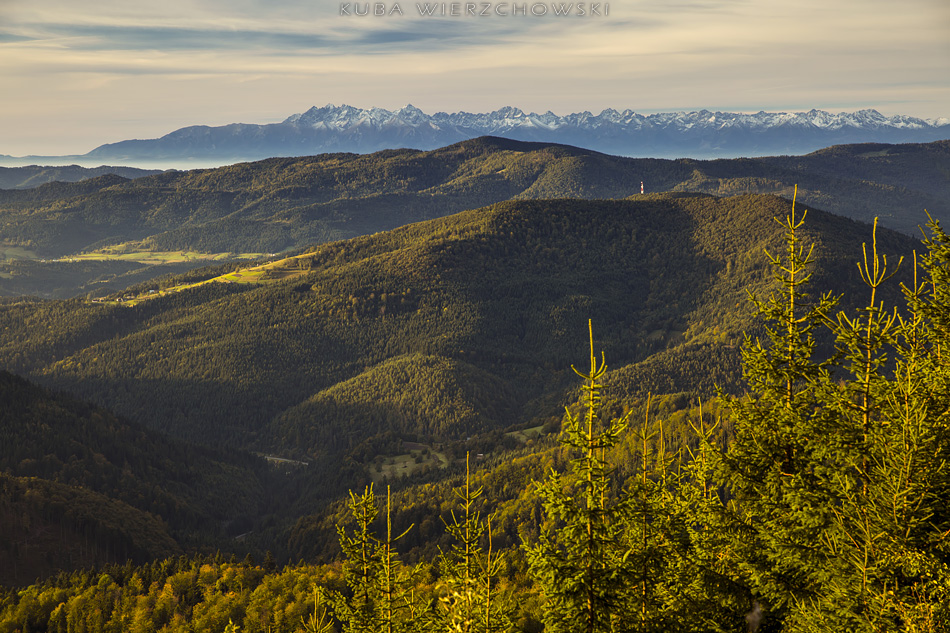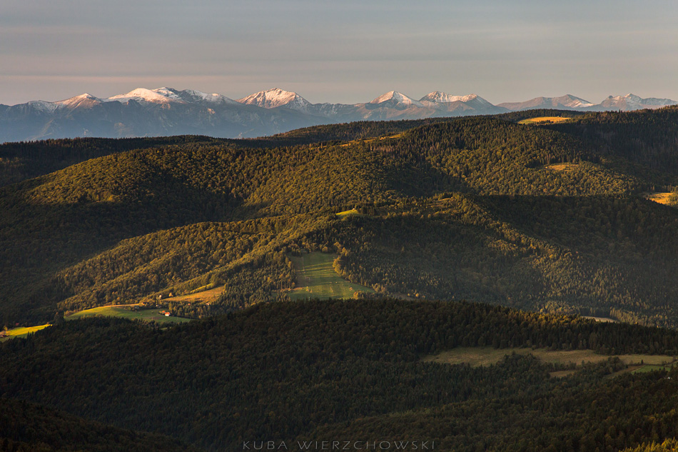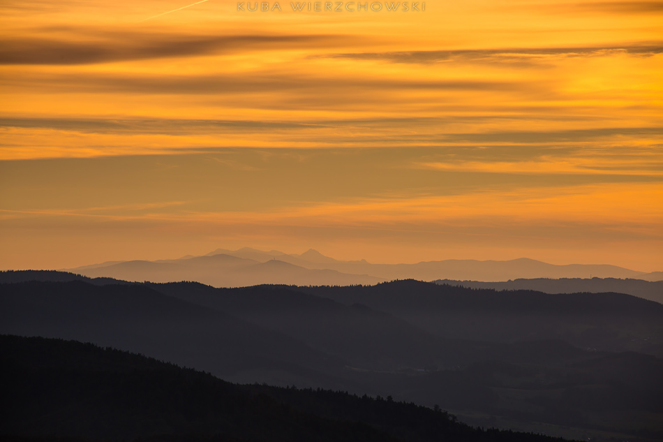 Po sierpniowych bardzo udanych wschodach i widokach w Pieninach, bałem się, że we wrześniu nie uda mi się nigdzie pojechać… ale zaraz po ostatnim weselu we wrześniu przyszły bardzo dobre warunki pogodowe, by się w plener udać. Zadzwonił do mnie kolega, że chciałby jechać w niedziele na Mogielice, więc zgodziłem się bez zastanowienia. Kilka dni temu spadł w Tatrach śnieg, więc liczyłem na niebanalne widoki dwóch pór roku! Ruszyliśmy już po południu. Pogoda była niesamowita… ciepło, wietrznie, widoczność zrobiła się bardzo dobra co widać na poszczególnych zdjęciach. Na pierwszych zdjęciach przedstawiłem Małą Fatrę i Beskid Żywiecki pod snującymi się złotymi chmurami. Mała Fatra oddalona jest w prostej linii o 100km, a widać poszczególne plany! Rano widoczność jeszcze bardziej się poprawiła, gdyż całą noc mocno wiało i mgły na które liczyłem uciekły razem z wiatrem. Zdjęcia robiło się bardzo trudno… wieża widokowa na szczycie trzęsła się i cóż mi ze statywu… ale jakoś dałem rade:) Kolejną daleką obserwacją była bardzo dobrze widoczna Bachurnia – szczyt na Słowacji w okolicach Preszowa! Tatry robiły też bardzo dobre wrażenie – lekko ośnieżone były przysłowiową wisienką na torcie i ładnie odcinały się nad Gorcami! Proszę Państwa złote kolory już niebawem!
