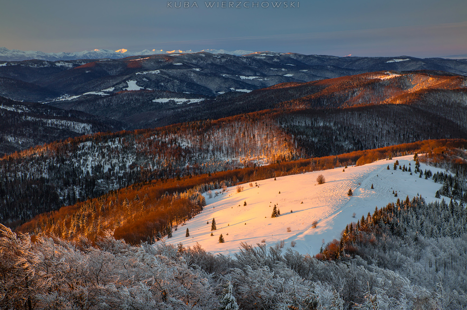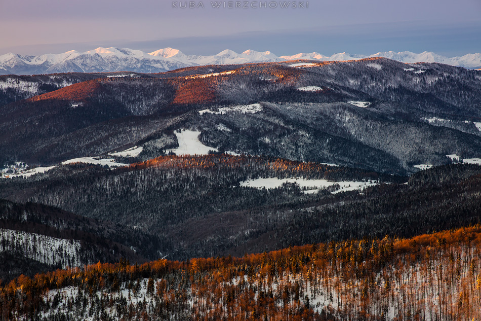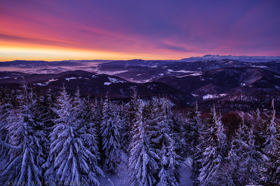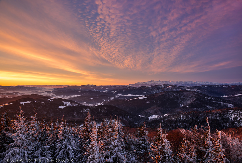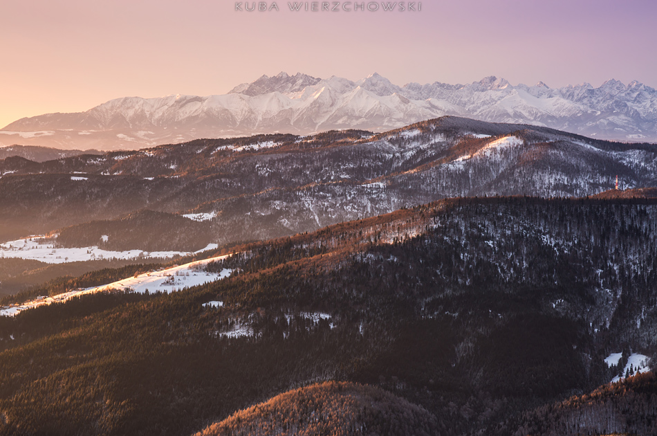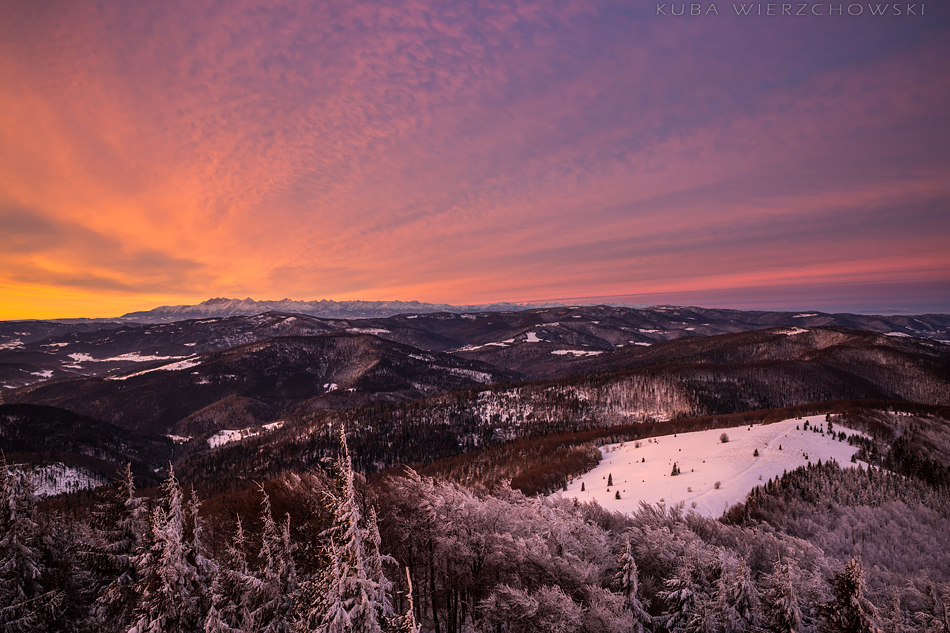 Tydzień po mroźnych Pieninach, pogoda znów była bardzo dynamiczna, nadchodziła zmiana ciśnienia i zapowiadały się czerwone kolory. Faktycznie prognoza na 7 stycznia była obiecująca i wskazywała na sporą ilość chmur piętra średniego o poranku. Urodziny można spędzić różnie. Ja postanowiłem wyczekiwać owych kolorów na moim ulubionym szczycie – Mogielicy:) Rok temu też w swoje urodziny pojechałem do Piekar i przywiozłem udane zdjęcia. Czyżby szykowała się powtórka? 🙂 O 5 rano wyszedłem po szybkim śniadaniu z wsi Chyszówki i udałem się w stronę zielonego szlaku. Księżyc świecił prawie w pełni, więc było jasno. Wiało jednak dosyć mocno, dlatego nawet nie chciałem myśleć co będzie działo się na górze. Jakieś 20 minut przed szczytem odsłonił się widok na wschód i południe. Już wiedziałem co się szykuje:) Chmury spowijały cienką warstwą niemal całe niebo, tylko południowo wschodnia część była czysta. Przyśpieszyłem kroku, by na górze włożyć jeszcze jeden polar i parę rękawiczek. Wiatr potęgował mróz wielokrotnie… Około 7 rozpoczął się spektakl. Widowisko barw, światła i chmur, krajobraz podkreślała doskonała widoczność. Światło odbite z okien schroniska pod Turbaczem było bardzo dobrze widoczne. Mała Fatra była tak samo wyraźna jak Gorce… Stałem w osłupieniu i patrzyłem jak niebo wręcz płonie. Przesuwałem statyw z miejsca na miejsce starając się pokazać to piękno jak najlepiej. A łatwo nie było – wieża widokowa na szczycie jest specyficzna. Trzeba się naprawdę nagimnastykować, żeby sfotografować… niebo. Po prostu niski daszek skutecznie zasłania to co dzieje się powyżej gór… Ostatnie zdjęcie na Tatry jest wykonane tylko 25 minut po wschodzie słońca i widać jak wszystko gaśnie, góry bledną, chmury schowały za sobą wstające słońce. Po chwili zaczął prószyć śnieg… Może i dobrze bo po prostu zamarzałem…. ale było magicznie:)!