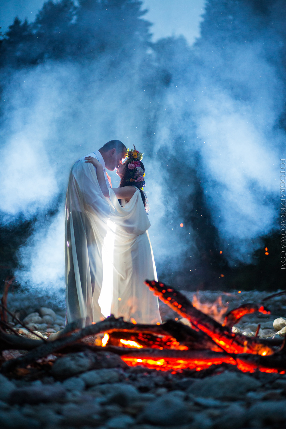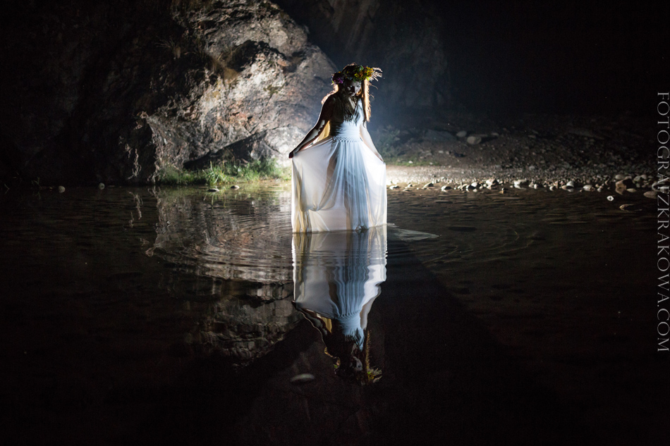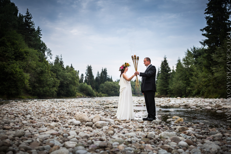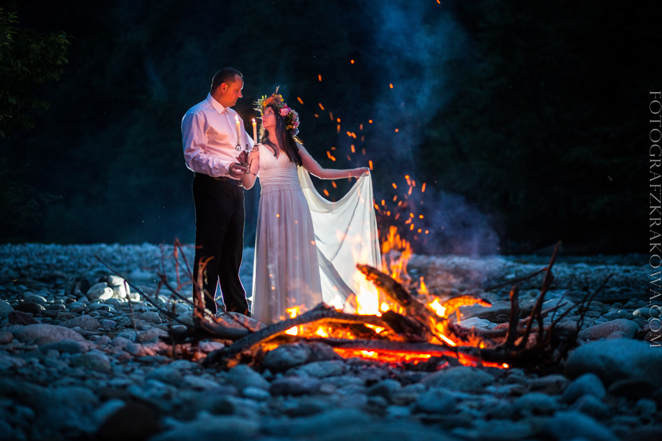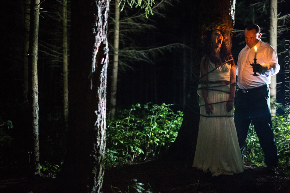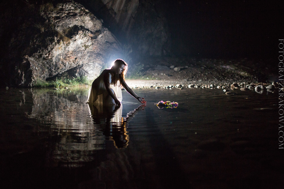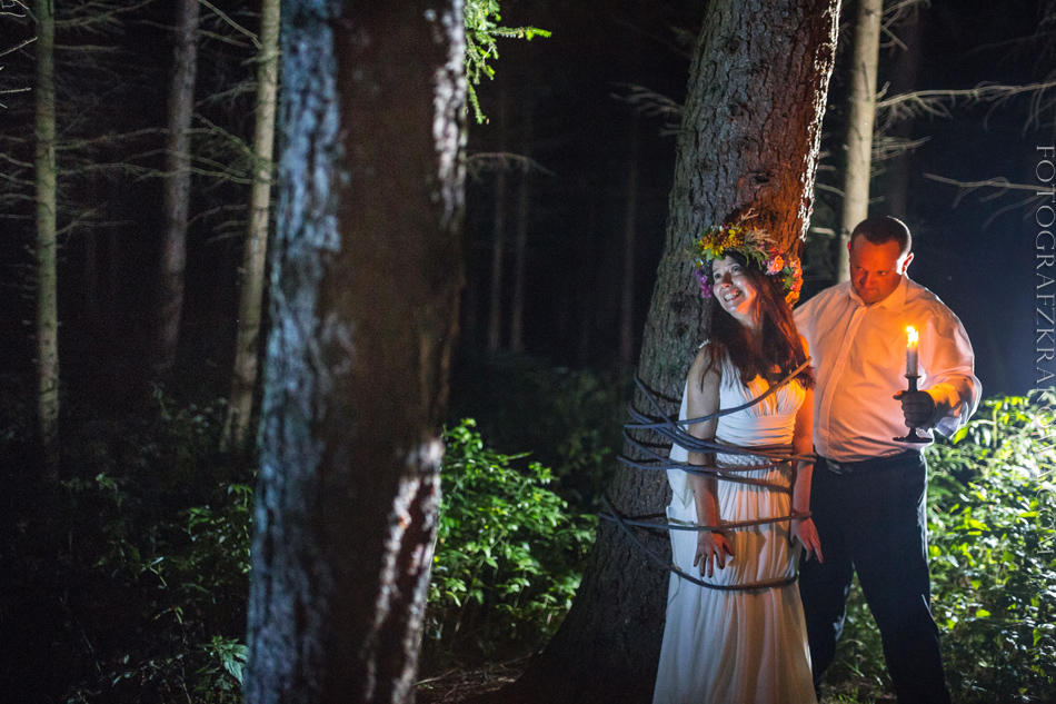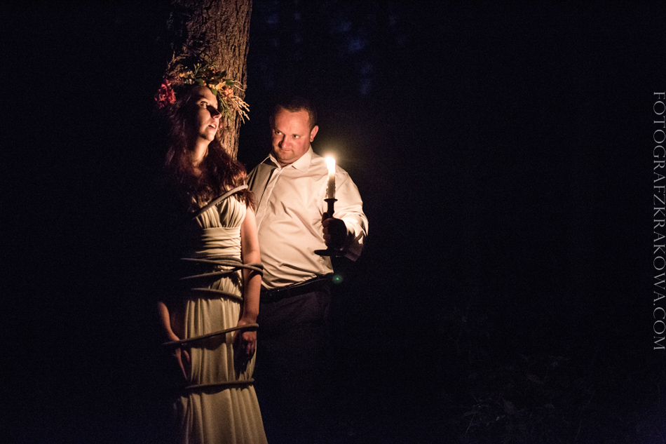 To para rock’n’rollowców, których znam od lat i rok temu powierzyli mi zadanie uwiecznienia ich ślubu:) Ale zanim wrzucę zdjęcia ze ślubu i wesela, chciałem Wam pokazać kilka ujęć z ich sesji… Już na weselu przyszedł mi do głowy pomysł na ich plener… Zaproponowałem Paulinie i Krzyśkowi klimat wody, nocy, ogniska… Sam jeszcze nie wiedziałem jak to będzie wyglądać, ale wspólnie stwierdziliśmy, że to będzie to;) Pół dnia przygotowań, ręcznie robione pochodnie, liny, świece, lampiony, ognisko, folia malarska etc… Zdjęcia skończyliśmy o 23 w zupełnych ciemnościach… A jak wyszło? Oceńcie sami:)