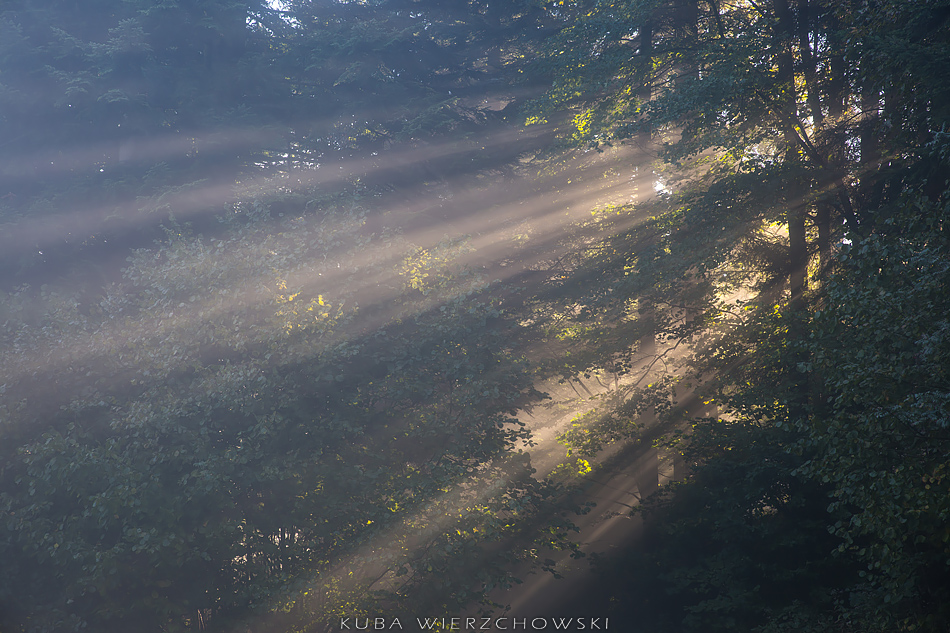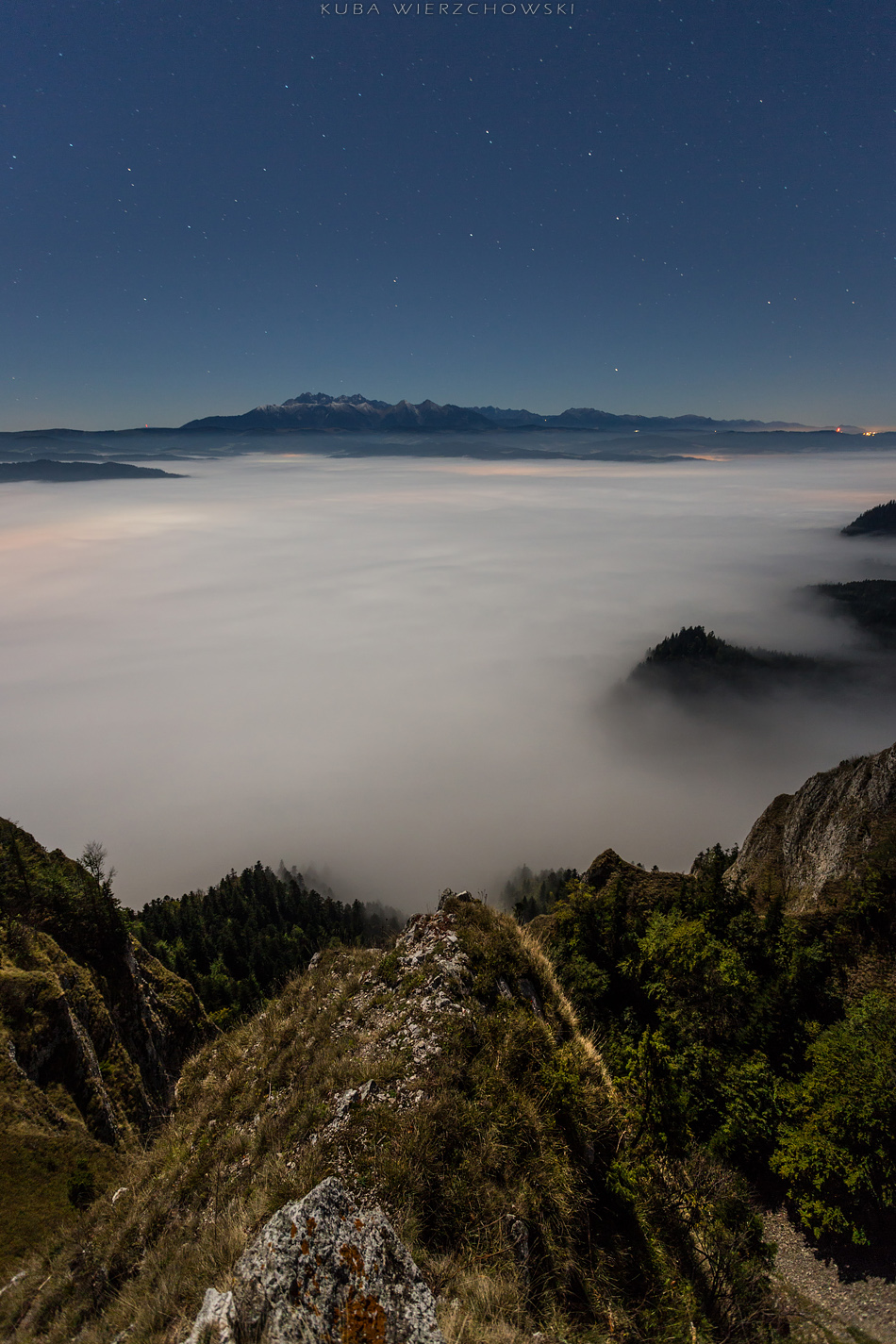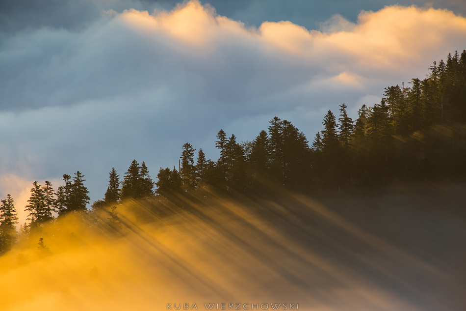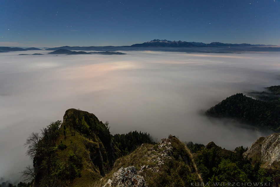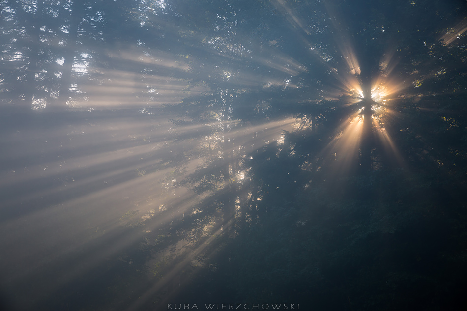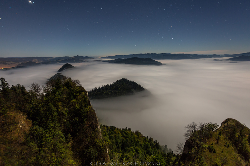 Totalnie szalona noc. Chyba najlepsza na tym szczycie. Chodzi oczywiście o Trzy Korony w Pieninach. Pomysł nad wyjazdem zrodził się już dwa dni wcześniej, gdy tylko zobaczyłem obiecujące prognozy pogody. (jakoś nie planuję wyjazdów z większym wyprzedzeniem, gdyż chcę być pewny warunków pogodowych). Jednak totalnie nie myślałem o Pieninach. W głowie były Gorce, Sądecki… Na kilka godzin przed wyjazdem na plenerze z Parą Młodą przyszło mi do głowy nocne zdjęcie z morzem mgieł. Jako że było niedługo po pełni szybko pomyślałem – a może jednak Trzy Korony? Wszak nie mam stamtąd zdjęć wykonanym nowym sprzętem:) 2 godziny snu, pobudka 23:15 i jazda do Kroscienka. Po drodze wszędzie ścieliły się mniej lub bardziej gęste mgły. O 3:30 byłem już na górze… księżycowa cisza przerywana głosem rykowiska jeleni … totalna magia ! Łysy świecił wysoko na niebie rozjaśniając cały krajobraz – niezwykły widok. Takich zdjęć brakowało mi w portfolio. A tak oklepany szczyt jak Trzy Korony zasługują na nieco inne zdjęcia:) Po półtora godzinnej walce z drgającą platformą widokową (na dłuższych czasach naświetlania wręcz wstrzymywałem oddech by zdjęcia były idealnie ostre), znużył mnie sen i zszedłem niżej położyć się na ławce… Jednak gdy ledwo usnąłem usłyszałem zbliżających się turystów-fotografów. Minęło mnie ich chyba 7-8 po czym usnąłem. Trzy Korony to mega popularny szczyt… zarówno za dnia jak i rano. Przyciąga widokami, a miejsca u góry jest na 15 osób (i to bez statywów:). Generalnie unikam tego szczytu gdyż można się tu natknąć na tłumy! W weekendy potrafi być tu 30 fotografujących osób!!! Pora jaką wybrałem na zdjęcia (3:30-5:00) była więc idealna, gdyż byłem tam oczywiście sam. Po godzinie drzemki, wygramoliłem się na szczyt dokonać „formalności” 😉 Przy 7 fotografujących osobach, da się w miarę swobodnie robić zdjęcia na tej platformie. Ale był to piątek rano… wolałem nie wiedzieć co będzie się tu działo w sobotni poranek, gdyż prognozy dla Pienin były bardzo fotograficzne również na weekend. Schodząc z powrotem zanurzyłem się we mgłę podziwiając cudowne promienie przebijające się przez drzewa.