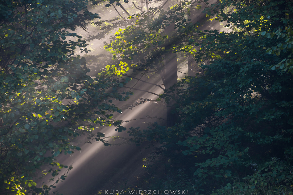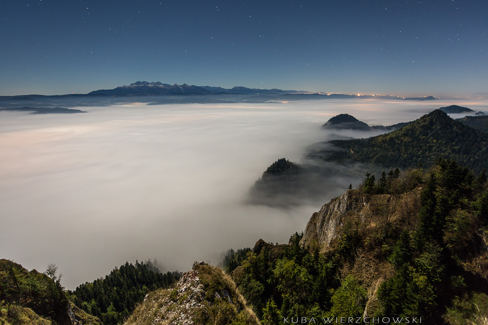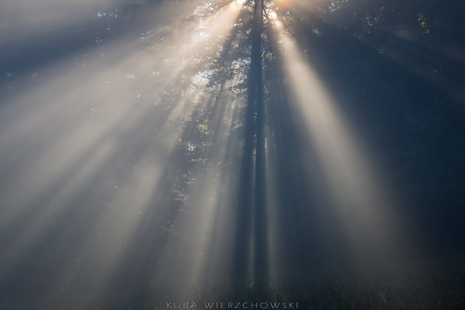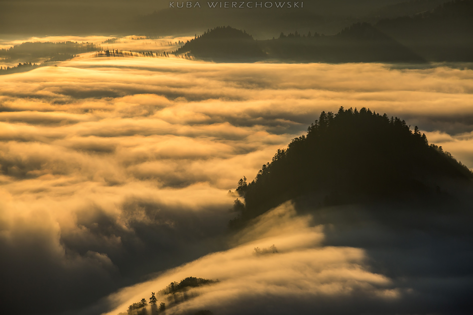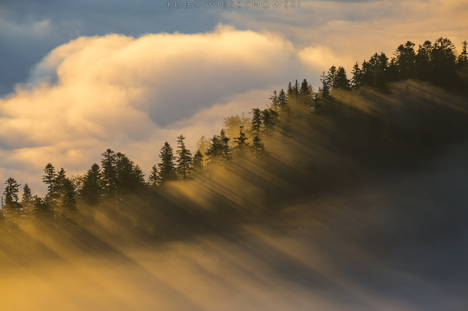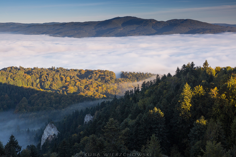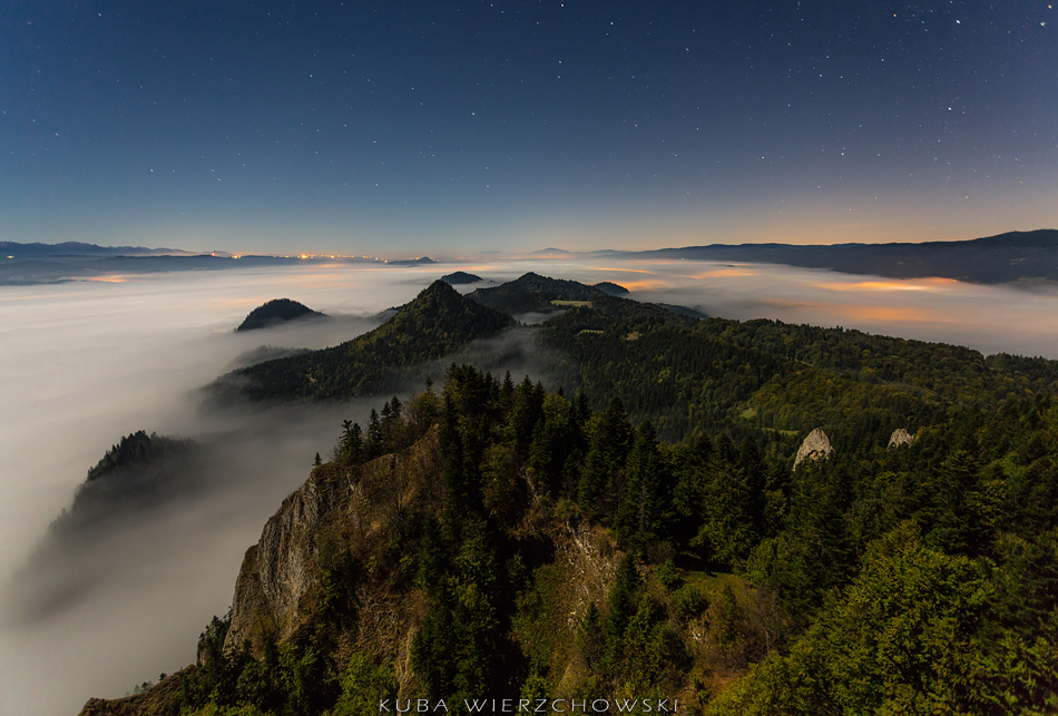 Totalnie szalona noc. Chyba najlepsza na tym szczycie. Chodzi oczywiście o Trzy Korony w Pieninach. Pomysł nad wyjazdem zrodził się już dwa dni wcześniej, gdy tylko zobaczyłem obiecujące prognozy pogody. (jakoś nie planuję wyjazdów z większym wyprzedzeniem, gdyż chcę być pewny warunków pogodowych). Jednak totalnie nie myślałem o Pieninach. W głowie były Gorce, Sądecki… Na kilka godzin przed wyjazdem na plenerze z Parą Młodą przyszło mi do głowy nocne zdjęcie z morzem mgieł. Jako że było niedługo po pełni szybko pomyślałem – a może jednak Trzy Korony? Wszak nie mam stamtąd zdjęć wykonanym nowym sprzętem:) 2 godziny snu, pobudka 23:15 i jazda do Kroscienka. Po drodze wszędzie ścieliły się mniej lub bardziej gęste mgły. O 3:30 byłem już na górze… księżycowa cisza przerywana głosem rykowiska jeleni … totalna magia ! Łysy świecił wysoko na niebie rozjaśniając cały krajobraz – niezwykły widok. Takich zdjęć brakowało mi w portfolio. A tak oklepany szczyt jak Trzy Korony zasługują na nieco inne zdjęcia:) Po półtora godzinnej walce z drgającą platformą widokową (na dłuższych czasach naświetlania wręcz wstrzymywałem oddech by zdjęcia były idealnie ostre), znużył mnie sen i zszedłem niżej położyć się na ławce… Jednak gdy ledwo usnąłem usłyszałem zbliżających się turystów-fotografów. Minęło mnie ich chyba 7-8 po czym usnąłem. Trzy Korony to mega popularny szczyt… zarówno za dnia jak i rano. Przyciąga widokami, a miejsca u góry jest na 15 osób (i to bez statywów:). Generalnie unikam tego szczytu gdyż można się tu natknąć na tłumy! W weekendy potrafi być tu 30 fotografujących osób!!! Pora jaką wybrałem na zdjęcia (3:30-5:00) była więc idealna, gdyż byłem tam oczywiście sam. Po godzinie drzemki, wygramoliłem się na szczyt dokonać „formalności” 😉 Przy 7 fotografujących osobach, da się w miarę swobodnie robić zdjęcia na tej platformie. Ale był to piątek rano… wolałem nie wiedzieć co będzie się tu działo w sobotni poranek, gdyż prognozy dla Pienin były bardzo fotograficzne również na weekend. Schodząc z powrotem zanurzyłem się we mgłę podziwiając cudowne promienie przebijające się przez drzewa.