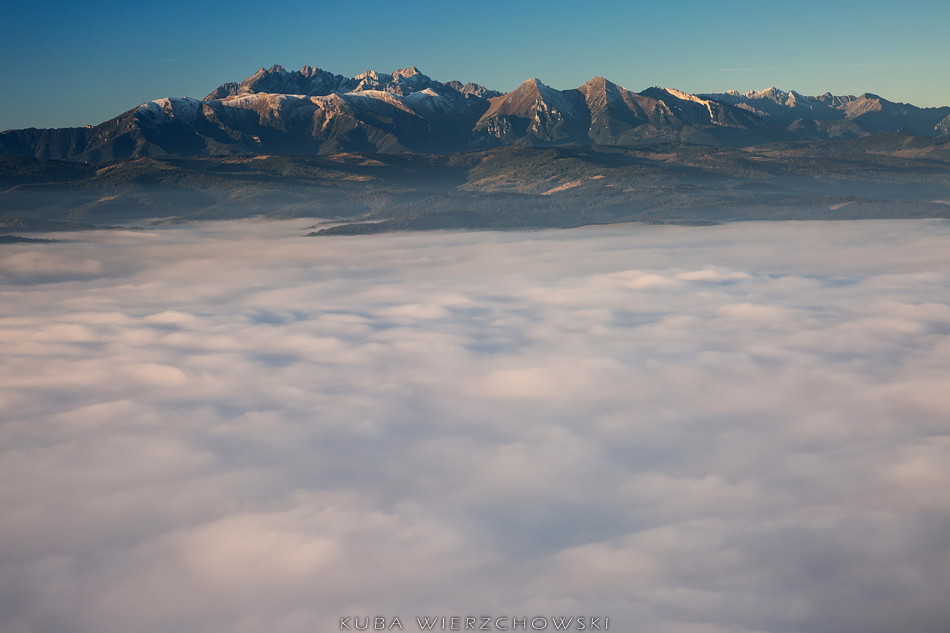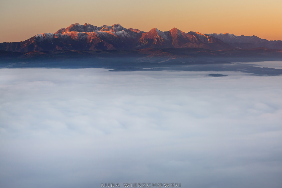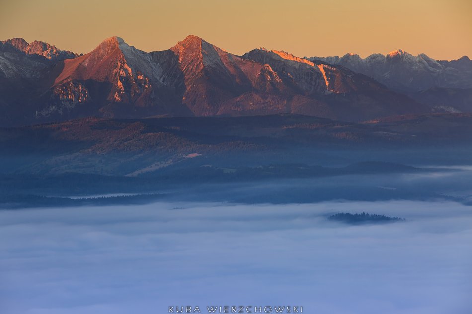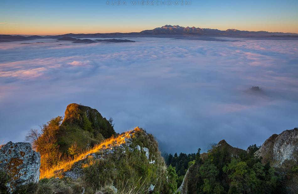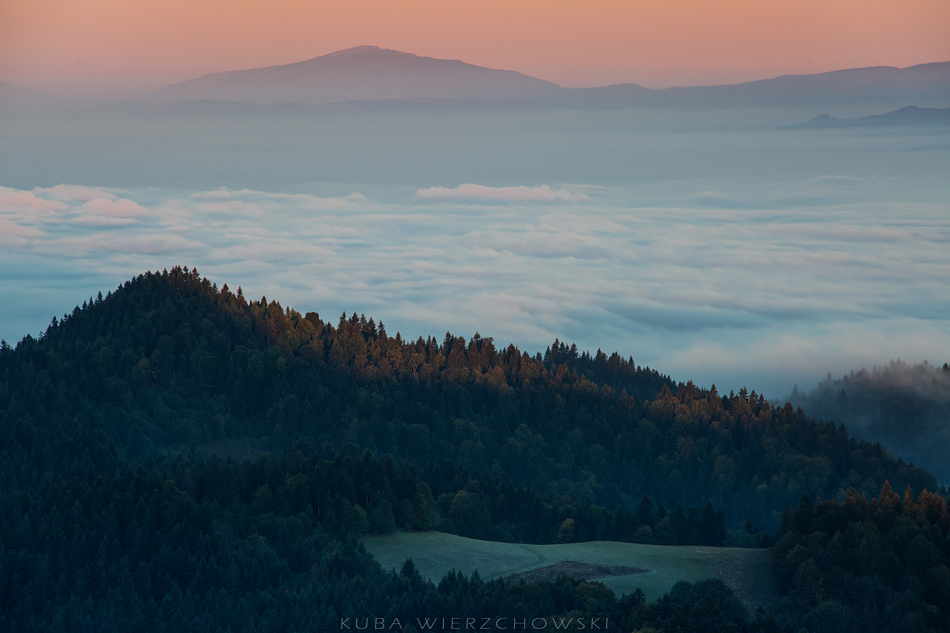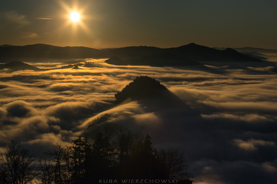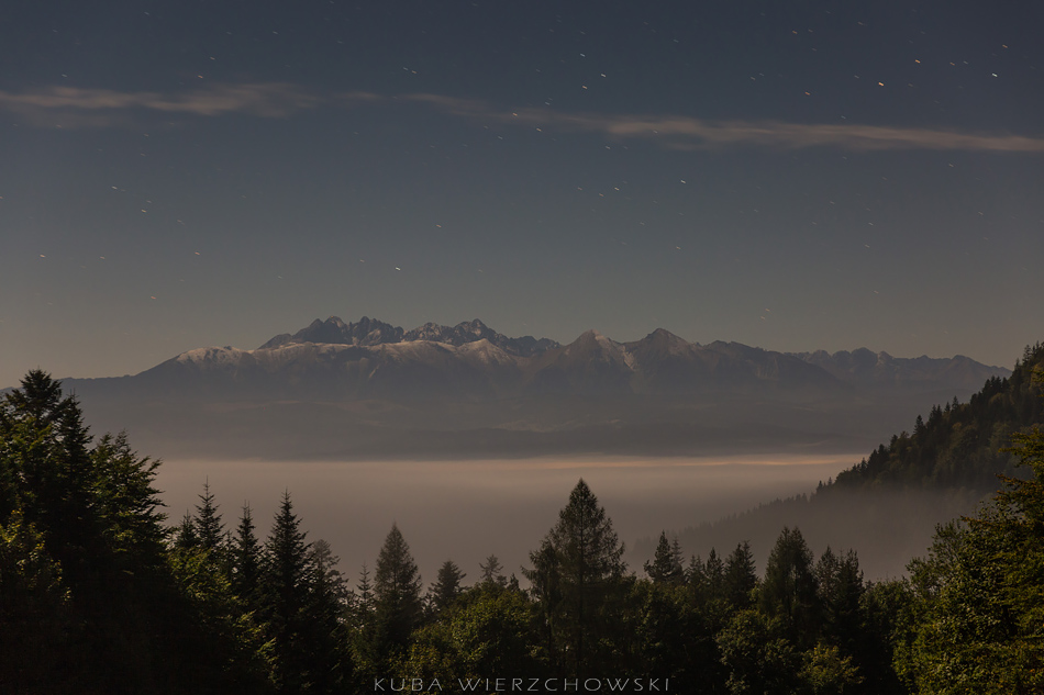 Totalnie szalona noc. Chyba najlepsza na tym szczycie. Chodzi oczywiście o Trzy Korony w Pieninach. Pomysł nad wyjazdem zrodził się już dwa dni wcześniej, gdy tylko zobaczyłem obiecujące prognozy pogody. (jakoś nie planuję wyjazdów z większym wyprzedzeniem, gdyż chcę być pewny warunków pogodowych). Jednak totalnie nie myślałem o Pieninach. W głowie były Gorce, Sądecki… Na kilka godzin przed wyjazdem na plenerze z Parą Młodą przyszło mi do głowy nocne zdjęcie z morzem mgieł. Jako że było niedługo po pełni szybko pomyślałem – a może jednak Trzy Korony? Wszak nie mam stamtąd zdjęć wykonanym nowym sprzętem:) 2 godziny snu, pobudka 23:15 i jazda do Kroscienka. Po drodze wszędzie ścieliły się mniej lub bardziej gęste mgły. O 3:30 byłem już na górze… księżycowa cisza przerywana głosem rykowiska jeleni … totalna magia ! Łysy świecił wysoko na niebie rozjaśniając cały krajobraz – niezwykły widok. Takich zdjęć brakowało mi w portfolio. A tak oklepany szczyt jak Trzy Korony zasługują na nieco inne zdjęcia:) Po półtora godzinnej walce z drgającą platformą widokową (na dłuższych czasach naświetlania wręcz wstrzymywałem oddech by zdjęcia były idealnie ostre), znużył mnie sen i zszedłem niżej położyć się na ławce… Jednak gdy ledwo usnąłem usłyszałem zbliżających się turystów-fotografów. Minęło mnie ich chyba 7-8 po czym usnąłem. Trzy Korony to mega popularny szczyt… zarówno za dnia jak i rano. Przyciąga widokami, a miejsca u góry jest na 15 osób (i to bez statywów:). Generalnie unikam tego szczytu gdyż można się tu natknąć na tłumy! W weekendy potrafi być tu 30 fotografujących osób!!! Pora jaką wybrałem na zdjęcia (3:30-5:00) była więc idealna, gdyż byłem tam oczywiście sam. Po godzinie drzemki, wygramoliłem się na szczyt dokonać „formalności” 😉 Przy 7 fotografujących osobach, da się w miarę swobodnie robić zdjęcia na tej platformie. Ale był to piątek rano… wolałem nie wiedzieć co będzie się tu działo w sobotni poranek, gdyż prognozy dla Pienin były bardzo fotograficzne również na weekend. Schodząc z powrotem zanurzyłem się we mgłę podziwiając cudowne promienie przebijające się przez drzewa.