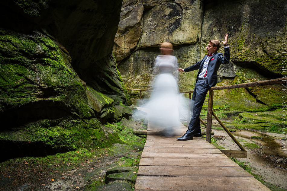 …czyli plener z Zuzią i Wojtkiem w czeskich Teplicach, gdzie przez swoje labirynty wiedzie szczególnie urokliwy szlak. Jako wspinacz wiele słyszałem o tym legendarnym miejscu. Jednak dopiero na miejscu człowiek czuje ogrom skalnych baszt, murów i wież… Skalne Miasto. Podczas pierwszych rozmów z bohaterami tej sesji padły nieśmiałe propozycje na Sudety, ale w dniu ślubu dowiedziałem sie o ich czeskim pomyśle;) Totalny obłęd! – Musimy tam jechać stwierdziłem! Tak też się stało – W dosyć chłodną lecz pogodną niedziele wybraliśmy się o 8 rano do Teplic, mimo iż ja byłem po którymś weselu, średnio wyspany i przeziębiony i jak sie okazało Zuzia tez nie była najzdrowsza. Cięte żarty Wojtka pomogły jednak przetrwać cały dzień i w mega humorach zrobilismy 6km pętlę w skałach:) Wróciliśmy o 22 wieczorem totalnie zmęczeni, jednak szczęśliwi, gdyż czeskie skały okazały się mega fotogenicznie, nie umniejszając oczywiście Zuzi o Wojtkowi, którzy kapitalnie odnaleźli się pozując w skałach:)