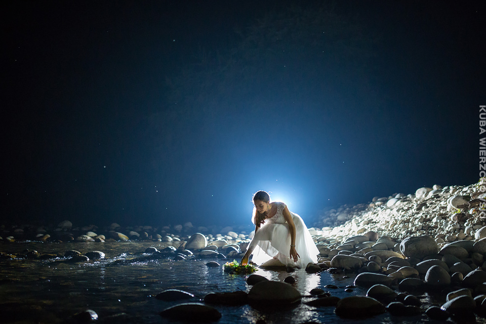 Długo musieliśmy czekać na plener. Ślub Julki i Łukasza był na początku czerwca, potem długa podróż poślubna na drugim końcu świata i tak zrobił nam się październik. Co prawda dopiero początek, ale w powietrzu czuć było jesień i nadchodzące załamanie pogody. Julka już chciała przekładać plener na odległą przyszłość. Jednak po zmobilizowaniu sił , udało nam się wyruszyć w drogę na plener:) Wybraliśmy miejsce, które będzie pasować klimatem do zamysłu sesji – woda, drzewa… Tak więc Białka – miejsce w sumie bardzo znane. Byliśmy w sobotnie popołudnie i w tym czasie pojawiło się kilka Nowożeńców, ale po szybkiej sesji wracali na wesele… W końcu zostaliśmy sami. Nastała noc, ogień tańczył nad wodą… Więcej takich sesji proszę:)