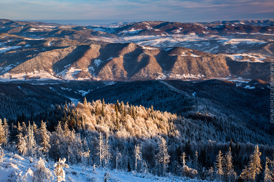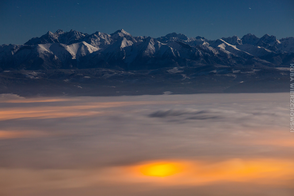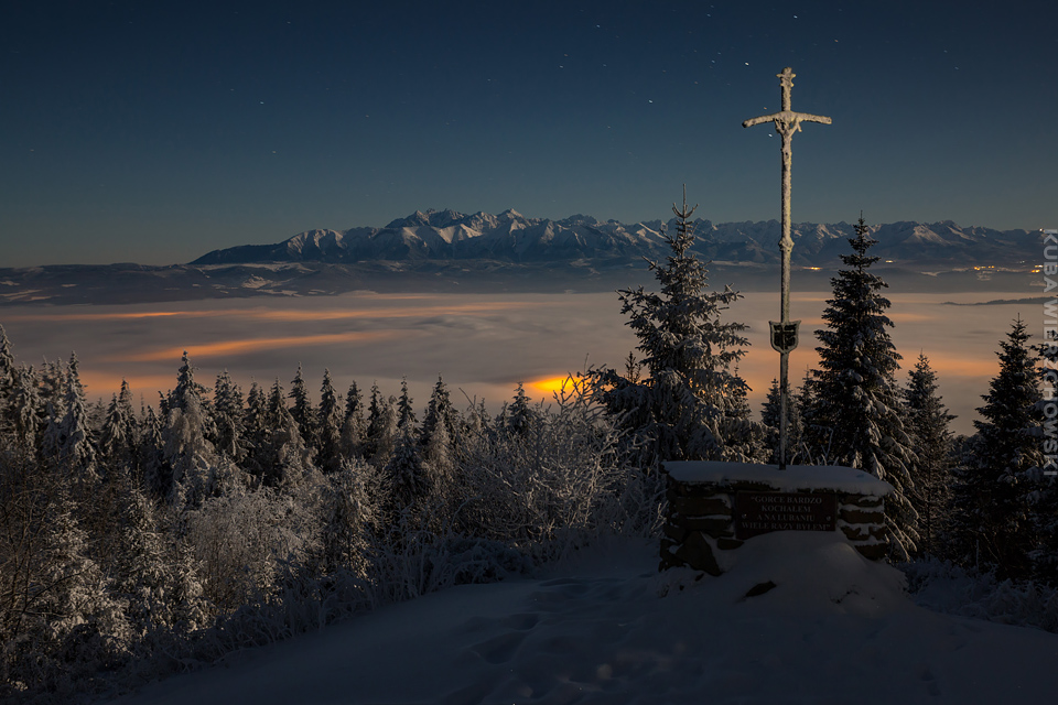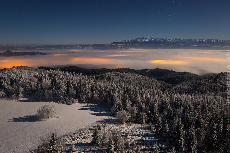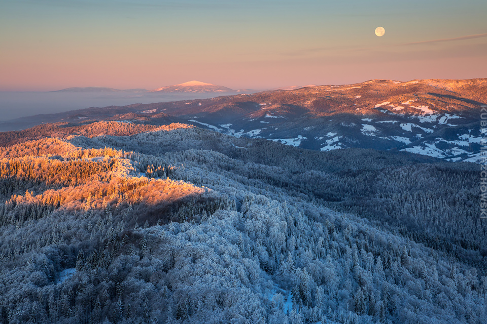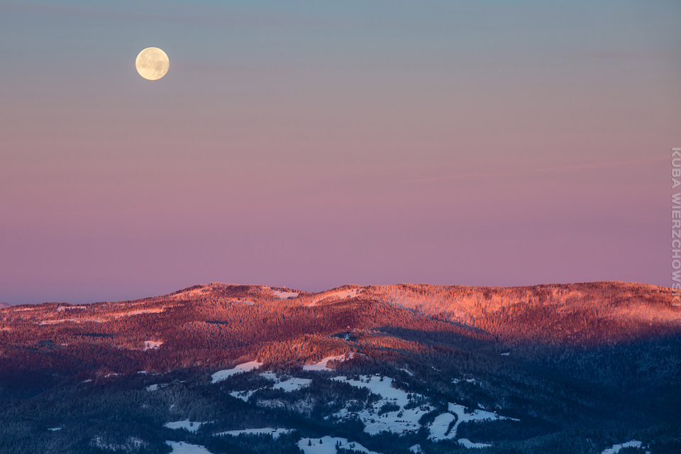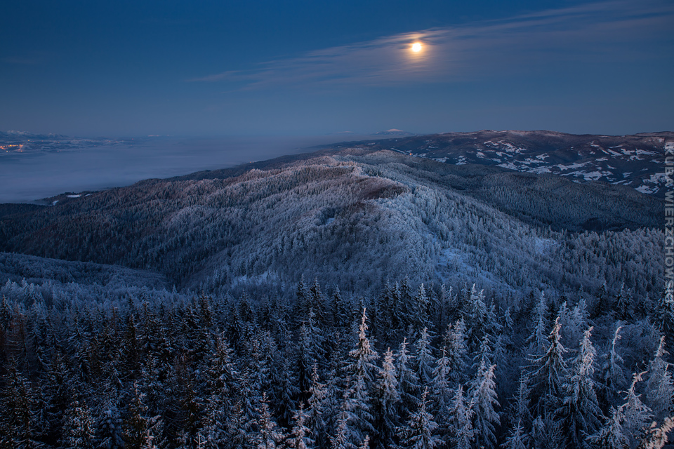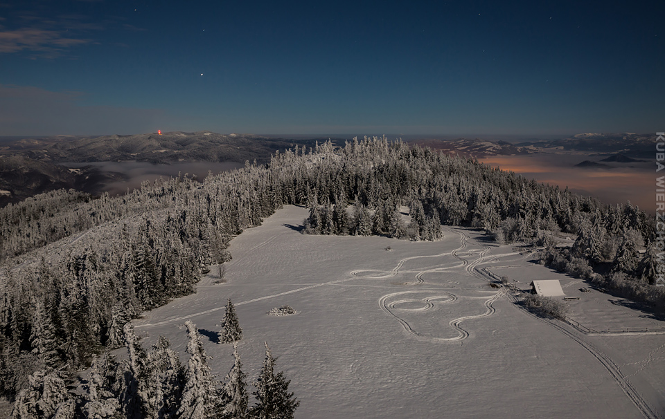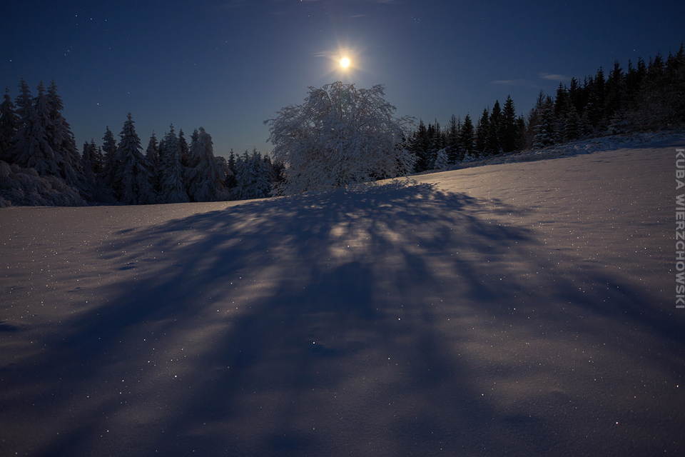Superksiężyc, supermoon, superpełnia… takie hasła przewijały się od kilku dni w mediach. W zasadzie nic dziwnego – tak blisko ziemi księżyc nie znajdował się od 68 lat… Dodatkowo dla Południowej Polski na noc 14/15 listopada 2016 przypadały bardzo korzystne warunki pogodowe do obserwacji nieba. Synoptycy zapowiadali pogodną i mroźną noc… Mnie jednak interesowało to, jakie tej nocy będzie światło. Księżyc w pełni, który wschodzi gdy zajdzie słońce i zachodzi gdy dzień się zaczyna, nocą będzie wysoko na niebie, będzie 30% jaśniejszy od „zwykłej” pełni! To trzeba wykorzystać na nietuzinkowe zdjęcia. Od początku myślałem o Lubaniu w Gorcach, i nie zmieniłem swoich planów. Mroziła mnie jednak myśl o fotografowaniu mroźną nocą… Cóż, dla sztuki trzeba się poświęcić;) Podobne plany fotograficzne miał znajomy fotograf Krystian z Gorlic, dlatego tym razem na Lubań postanowiłem nie iść samemu. Punktualnie o 1 w nocy spotkaliśmy się w Grywałdzie, by za chwilę ruszyć szlakiem do góry. W zasadzie czołówki, latarki były zbędne… Było faktycznie niecodziennie jasno. Obawialiśmy się tylko sporej ilości białego puchu co okazało się niesłuszne – było go w sam raz – szło się bardzo wygodnie po iskrzącym się srebrnym światłem śniegu. Na szczyt Lubania dotarliśmy w 1,5 godziny. Wiedzieliśmy, że do rana daleko stąd specjalnie nie spieszyliśmy się. Dopiero tutaj na polanie, w mroźnej ciszy zobaczyłem jak naprawdę jest jasno! Z wieży widokowej było widać wszystkie góry na około łącznie z Beskidem Żywieckim i Małą Fatrą!!! W panoramie tatrzańskiej dało się rozróżnić każdy żleb i szczyt… a była przecież 2:50 w nocy!!! Księżyc bardzo wysoko na niebie – oświetlał horyzont idealnie. Mając bardzo dużo czasu do wschodu słońca (4 godziny) ubraliśmy się w dodatkowe ciuchy i powoli zaczęliśmy robić zdjęcia… Do 5 nad ranem czas minął bardzo szybko, a myślałem że do rana po prostu nie dotrwam… Też macie tak, że nad ranem gdy noc już się kończy jedna godzina Wam gdzieś ucieka? Już któryś raz spotyka mnie to w górach czy innych okolicznościach. Na wschodzie zaczęło się rozjaśniać, tymczasem księżyc dalej świecił mocno na zachodzie – wyglądało to bardzo ciekawie – zwłaszcza na polanie, gdzie samotne drzewo rzucało cień od księżyca… Sam wschód słońca był bardzo ostry, góry zapaliły się mocnym pomarańczo czerwonym światłem. Widoczność jeszcze bardziej się poprawiła, dostrzegłem nawet Makowicę w Slańskich Wierchach daleko za Koszycami i Preszowem na Słowacji (bagatela 109km w linii prostej!). Totalnie zmęczony z zimna i niewyspania skończyłem zdjęcia o 8:13 już na polanie w scenerii białych drzew. Bardzo ciekawie było też w drodze powrotnej, gdzie zatrzymałem się po kilka ujęć zmrożonych drzew… Znużenie jednak bardzo szybko mnie dopadło i musiałem zatrzymać się na stacji by zdrzemnąć się chwilę… Po godzinie snu, pojechałem dalej… już bez przygód dotarłem do Krakowa. Zachęcam też zajrzeć na zdjęcia Krystiana:)