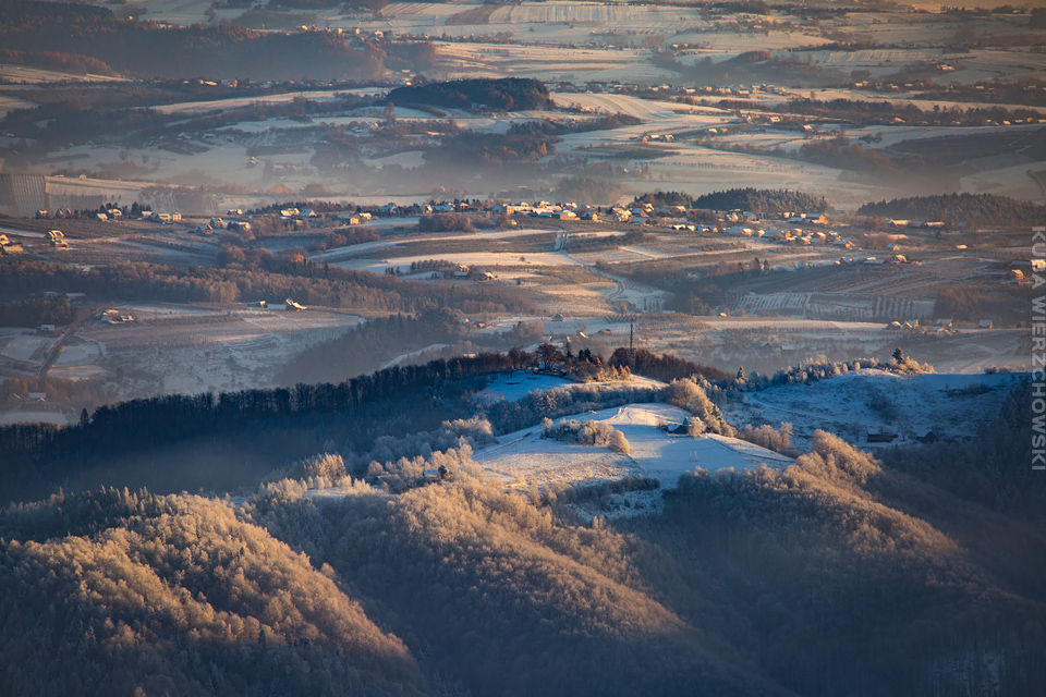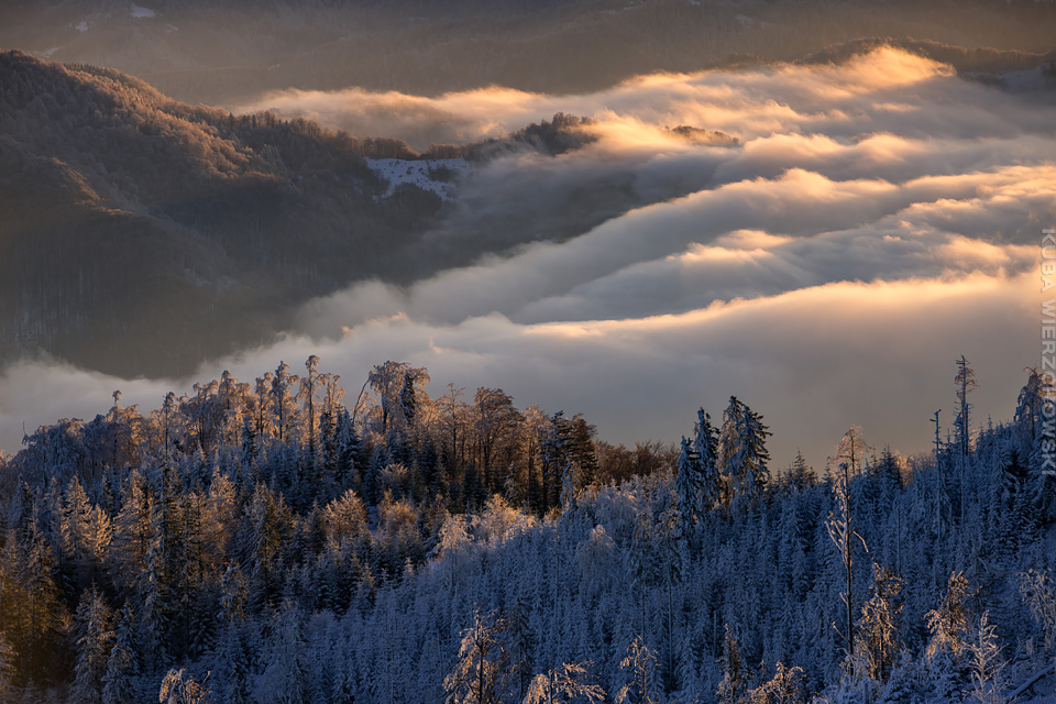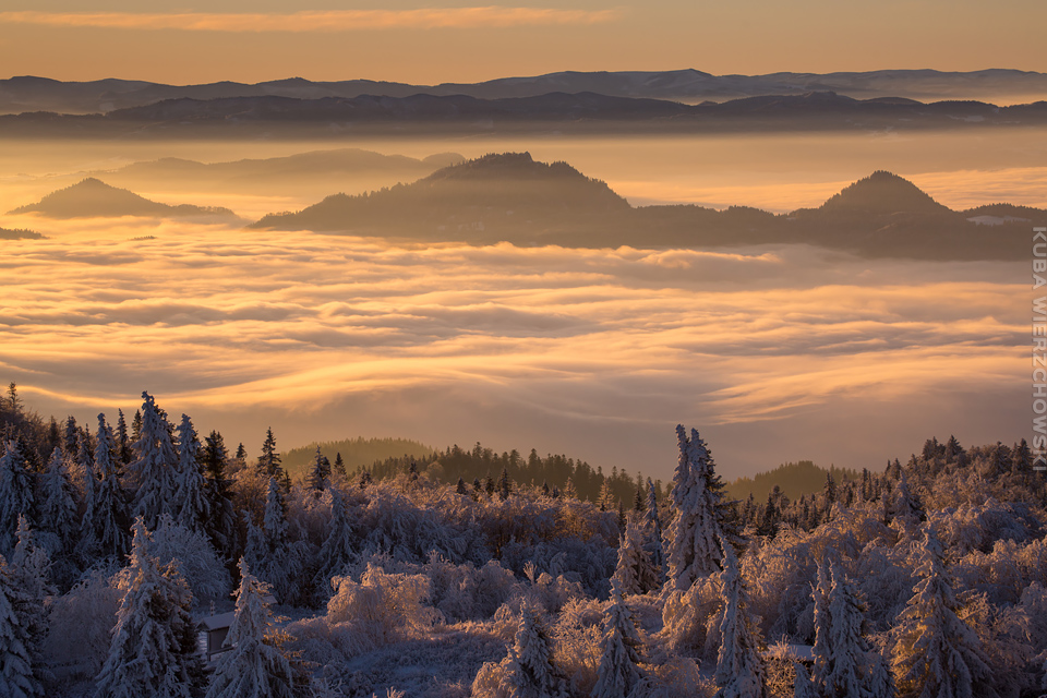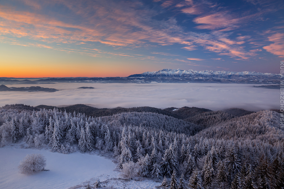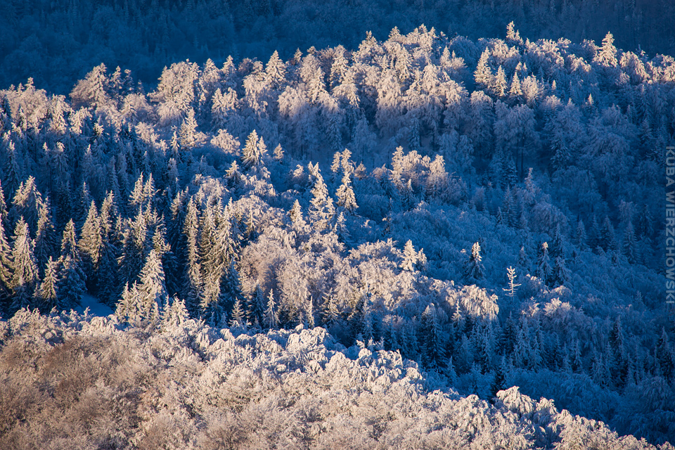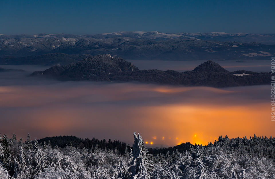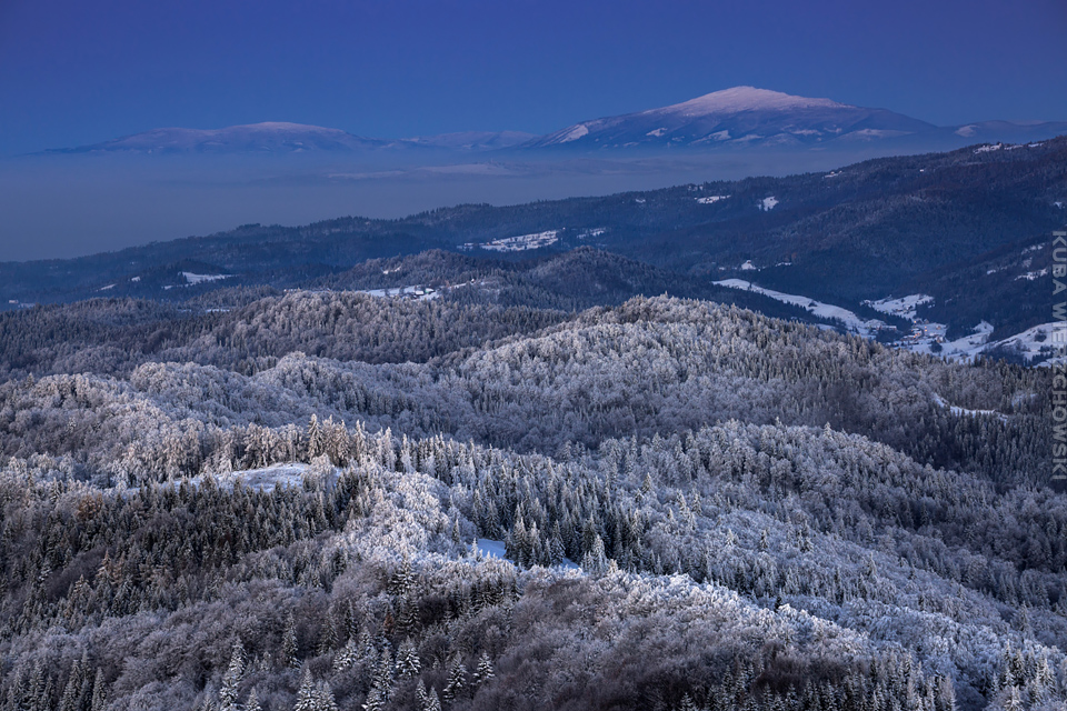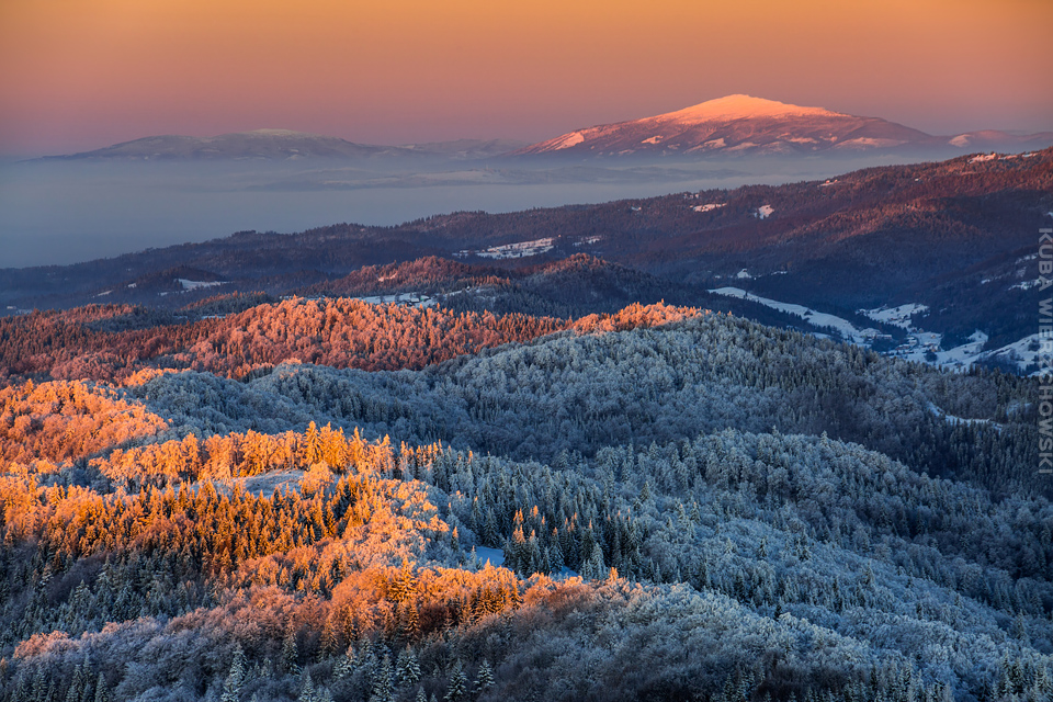 Superksiężyc, supermoon, superpełnia… takie hasła przewijały się od kilku dni w mediach. W zasadzie nic dziwnego – tak blisko ziemi księżyc nie znajdował się od 68 lat… Dodatkowo dla Południowej Polski na noc 14/15 listopada 2016 przypadały bardzo korzystne warunki pogodowe do obserwacji nieba. Synoptycy zapowiadali pogodną i mroźną noc… Mnie jednak interesowało to, jakie tej nocy będzie światło. Księżyc w pełni, który wschodzi gdy zajdzie słońce i zachodzi gdy dzień się zaczyna, nocą będzie wysoko na niebie, będzie 30% jaśniejszy od „zwykłej” pełni! To trzeba wykorzystać na nietuzinkowe zdjęcia. Od początku myślałem o Lubaniu w Gorcach, i nie zmieniłem swoich planów. Mroziła mnie jednak myśl o fotografowaniu mroźną nocą… Cóż, dla sztuki trzeba się poświęcić;) Podobne plany fotograficzne miał znajomy fotograf Krystian z Gorlic, dlatego tym razem na Lubań postanowiłem nie iść samemu. Punktualnie o 1 w nocy spotkaliśmy się w Grywałdzie, by za chwilę ruszyć szlakiem do góry. W zasadzie czołówki, latarki były zbędne… Było faktycznie niecodziennie jasno. Obawialiśmy się tylko sporej ilości białego puchu co okazało się niesłuszne – było go w sam raz – szło się bardzo wygodnie po iskrzącym się srebrnym światłem śniegu. Na szczyt Lubania dotarliśmy w 1,5 godziny. Wiedzieliśmy, że do rana daleko stąd specjalnie nie spieszyliśmy się. Dopiero tutaj na polanie, w mroźnej ciszy zobaczyłem jak naprawdę jest jasno! Z wieży widokowej było widać wszystkie góry na około łącznie z Beskidem Żywieckim i Małą Fatrą!!! W panoramie tatrzańskiej dało się rozróżnić każdy żleb i szczyt… a była przecież 2:50 w nocy!!! Księżyc bardzo wysoko na niebie – oświetlał horyzont idealnie. Mając bardzo dużo czasu do wschodu słońca (4 godziny) ubraliśmy się w dodatkowe ciuchy i powoli zaczęliśmy robić zdjęcia… Do 5 nad ranem czas minął bardzo szybko, a myślałem że do rana po prostu nie dotrwam… Też macie tak, że nad ranem gdy noc już się kończy jedna godzina Wam gdzieś ucieka? Już któryś raz spotyka mnie to w górach czy innych okolicznościach. Na wschodzie zaczęło się rozjaśniać, tymczasem księżyc dalej świecił mocno na zachodzie – wyglądało to bardzo ciekawie – zwłaszcza na polanie, gdzie samotne drzewo rzucało cień od księżyca… Sam wschód słońca był bardzo ostry, góry zapaliły się mocnym pomarańczo czerwonym światłem. Widoczność jeszcze bardziej się poprawiła, dostrzegłem nawet Makowicę w Slańskich Wierchach daleko za Koszycami i Preszowem na Słowacji (bagatela 109km w linii prostej!). Totalnie zmęczony z zimna i niewyspania skończyłem zdjęcia o 8:13 już na polanie w scenerii białych drzew. Bardzo ciekawie było też w drodze powrotnej, gdzie zatrzymałem się po kilka ujęć zmrożonych drzew… Znużenie jednak bardzo szybko mnie dopadło i musiałem zatrzymać się na stacji by zdrzemnąć się chwilę… Po godzinie snu, pojechałem dalej… już bez przygód dotarłem do Krakowa. Zachęcam też zajrzeć na zdjęcia Krystiana:)