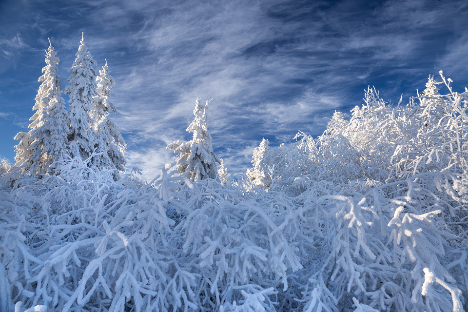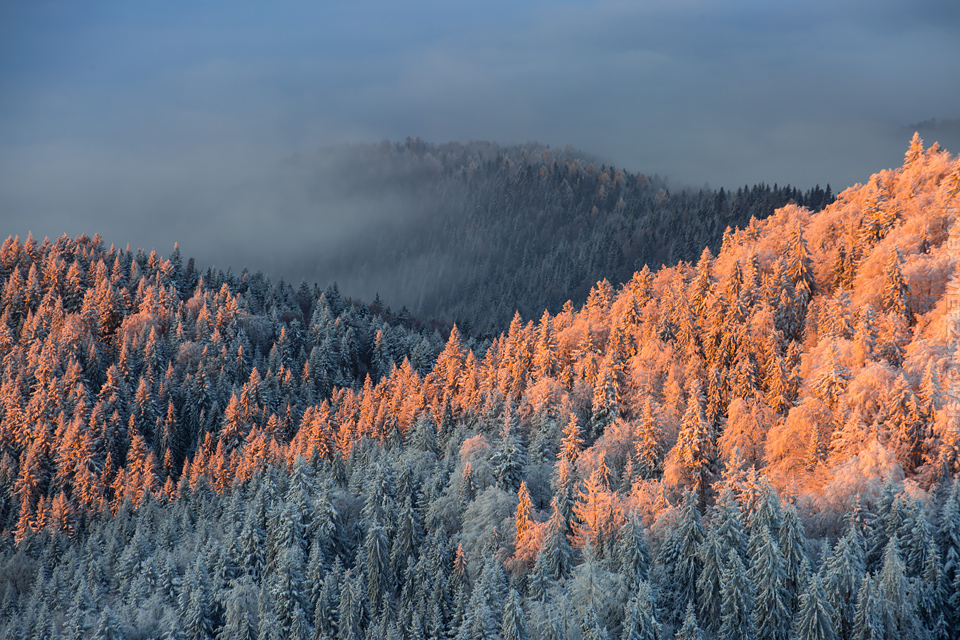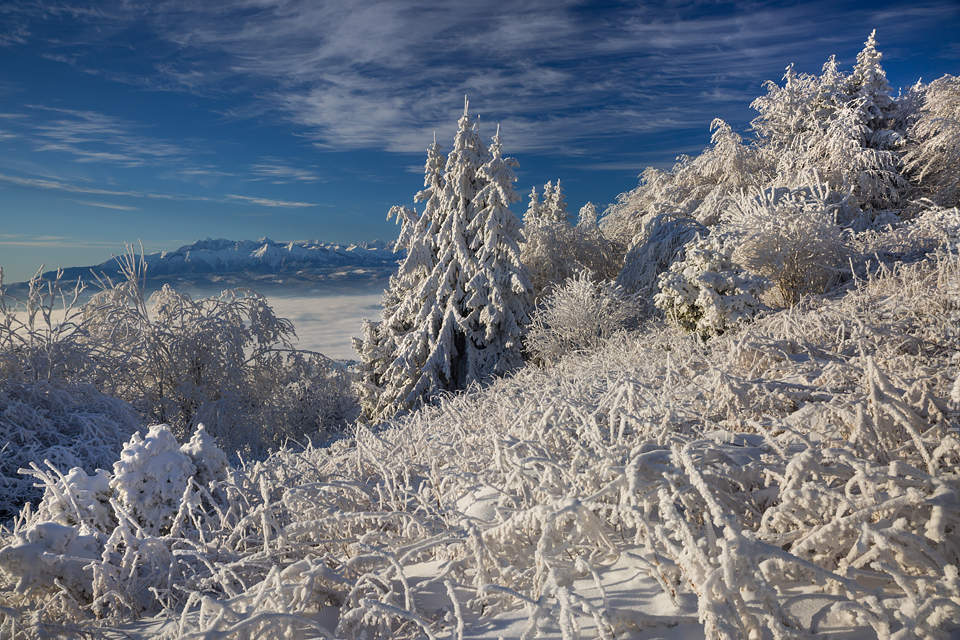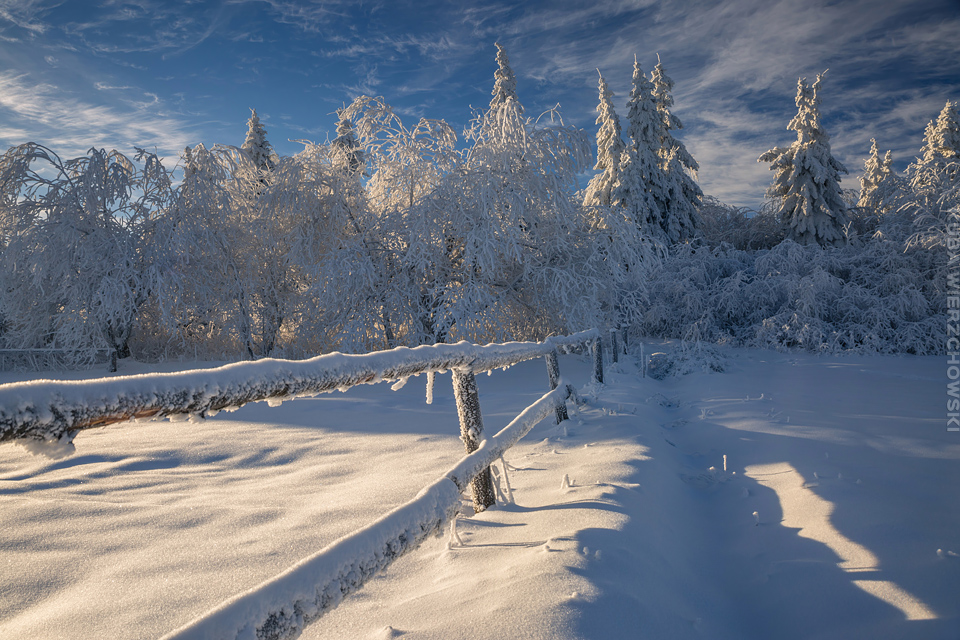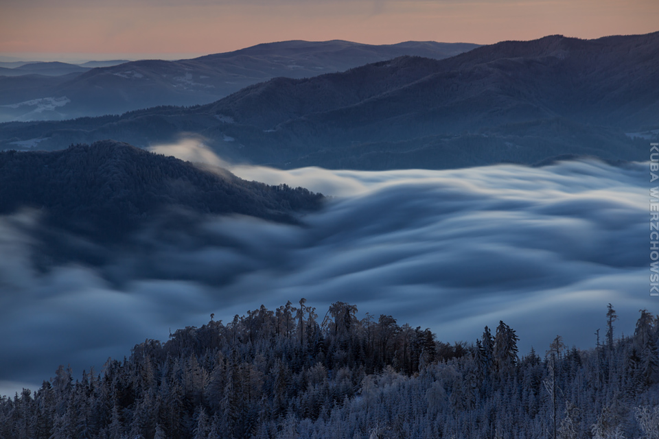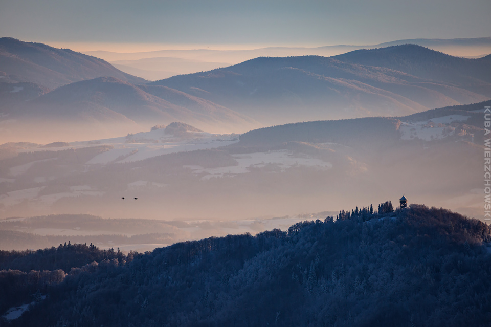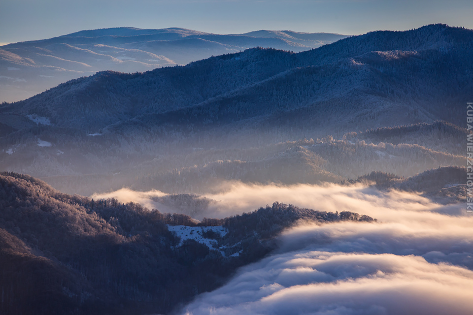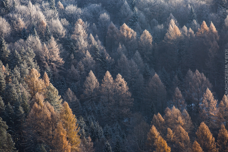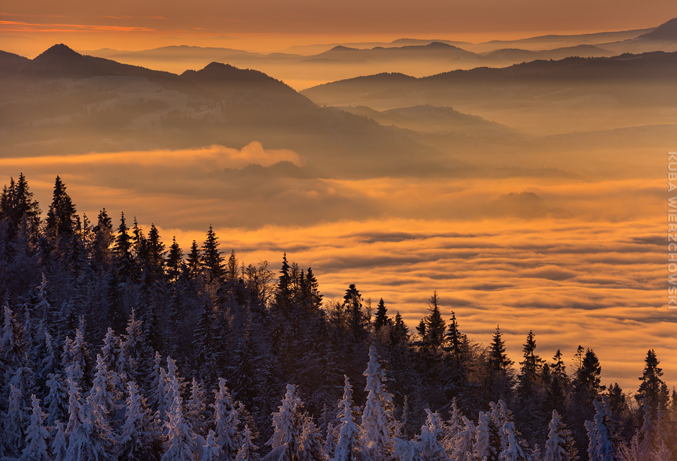 Superksiężyc, supermoon, superpełnia… takie hasła przewijały się od kilku dni w mediach. W zasadzie nic dziwnego – tak blisko ziemi księżyc nie znajdował się od 68 lat… Dodatkowo dla Południowej Polski na noc 14/15 listopada 2016 przypadały bardzo korzystne warunki pogodowe do obserwacji nieba. Synoptycy zapowiadali pogodną i mroźną noc… Mnie jednak interesowało to, jakie tej nocy będzie światło. Księżyc w pełni, który wschodzi gdy zajdzie słońce i zachodzi gdy dzień się zaczyna, nocą będzie wysoko na niebie, będzie 30% jaśniejszy od „zwykłej” pełni! To trzeba wykorzystać na nietuzinkowe zdjęcia. Od początku myślałem o Lubaniu w Gorcach, i nie zmieniłem swoich planów. Mroziła mnie jednak myśl o fotografowaniu mroźną nocą… Cóż, dla sztuki trzeba się poświęcić;) Podobne plany fotograficzne miał znajomy fotograf Krystian z Gorlic, dlatego tym razem na Lubań postanowiłem nie iść samemu. Punktualnie o 1 w nocy spotkaliśmy się w Grywałdzie, by za chwilę ruszyć szlakiem do góry. W zasadzie czołówki, latarki były zbędne… Było faktycznie niecodziennie jasno. Obawialiśmy się tylko sporej ilości białego puchu co okazało się niesłuszne – było go w sam raz – szło się bardzo wygodnie po iskrzącym się srebrnym światłem śniegu. Na szczyt Lubania dotarliśmy w 1,5 godziny. Wiedzieliśmy, że do rana daleko stąd specjalnie nie spieszyliśmy się. Dopiero tutaj na polanie, w mroźnej ciszy zobaczyłem jak naprawdę jest jasno! Z wieży widokowej było widać wszystkie góry na około łącznie z Beskidem Żywieckim i Małą Fatrą!!! W panoramie tatrzańskiej dało się rozróżnić każdy żleb i szczyt… a była przecież 2:50 w nocy!!! Księżyc bardzo wysoko na niebie – oświetlał horyzont idealnie. Mając bardzo dużo czasu do wschodu słońca (4 godziny) ubraliśmy się w dodatkowe ciuchy i powoli zaczęliśmy robić zdjęcia… Do 5 nad ranem czas minął bardzo szybko, a myślałem że do rana po prostu nie dotrwam… Też macie tak, że nad ranem gdy noc już się kończy jedna godzina Wam gdzieś ucieka? Już któryś raz spotyka mnie to w górach czy innych okolicznościach. Na wschodzie zaczęło się rozjaśniać, tymczasem księżyc dalej świecił mocno na zachodzie – wyglądało to bardzo ciekawie – zwłaszcza na polanie, gdzie samotne drzewo rzucało cień od księżyca… Sam wschód słońca był bardzo ostry, góry zapaliły się mocnym pomarańczo czerwonym światłem. Widoczność jeszcze bardziej się poprawiła, dostrzegłem nawet Makowicę w Slańskich Wierchach daleko za Koszycami i Preszowem na Słowacji (bagatela 109km w linii prostej!). Totalnie zmęczony z zimna i niewyspania skończyłem zdjęcia o 8:13 już na polanie w scenerii białych drzew. Bardzo ciekawie było też w drodze powrotnej, gdzie zatrzymałem się po kilka ujęć zmrożonych drzew… Znużenie jednak bardzo szybko mnie dopadło i musiałem zatrzymać się na stacji by zdrzemnąć się chwilę… Po godzinie snu, pojechałem dalej… już bez przygód dotarłem do Krakowa. Zachęcam też zajrzeć na zdjęcia Krystiana:)