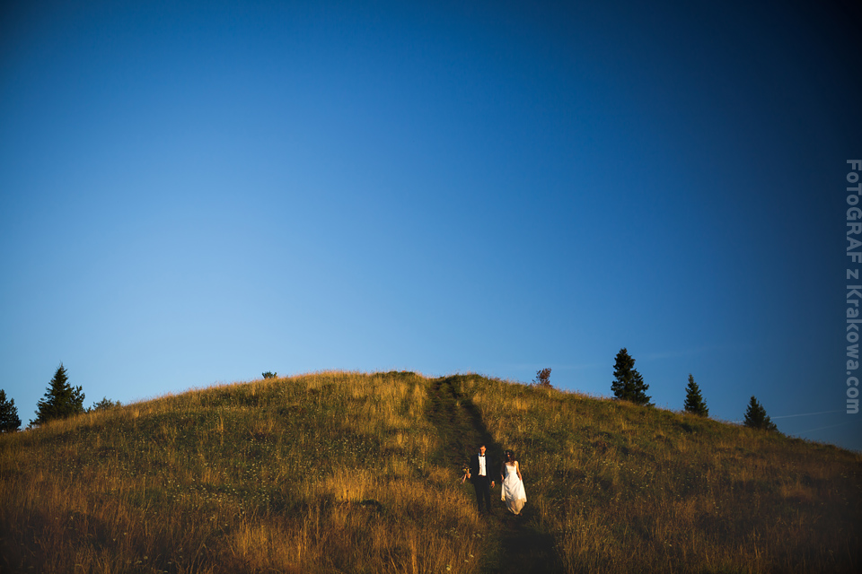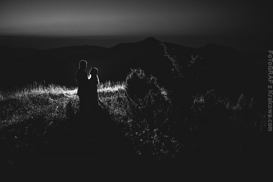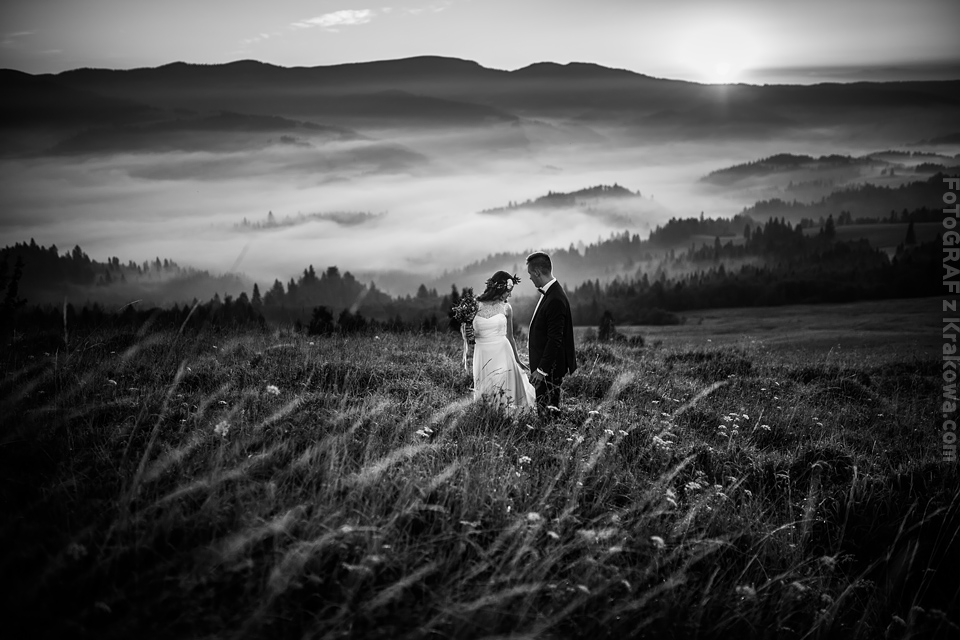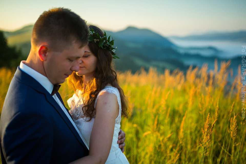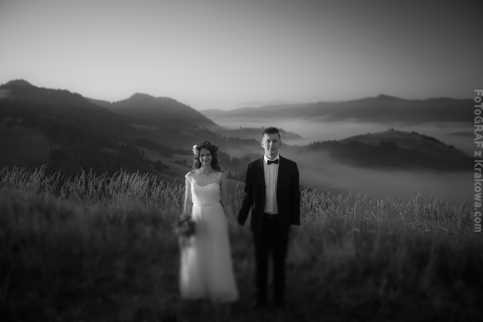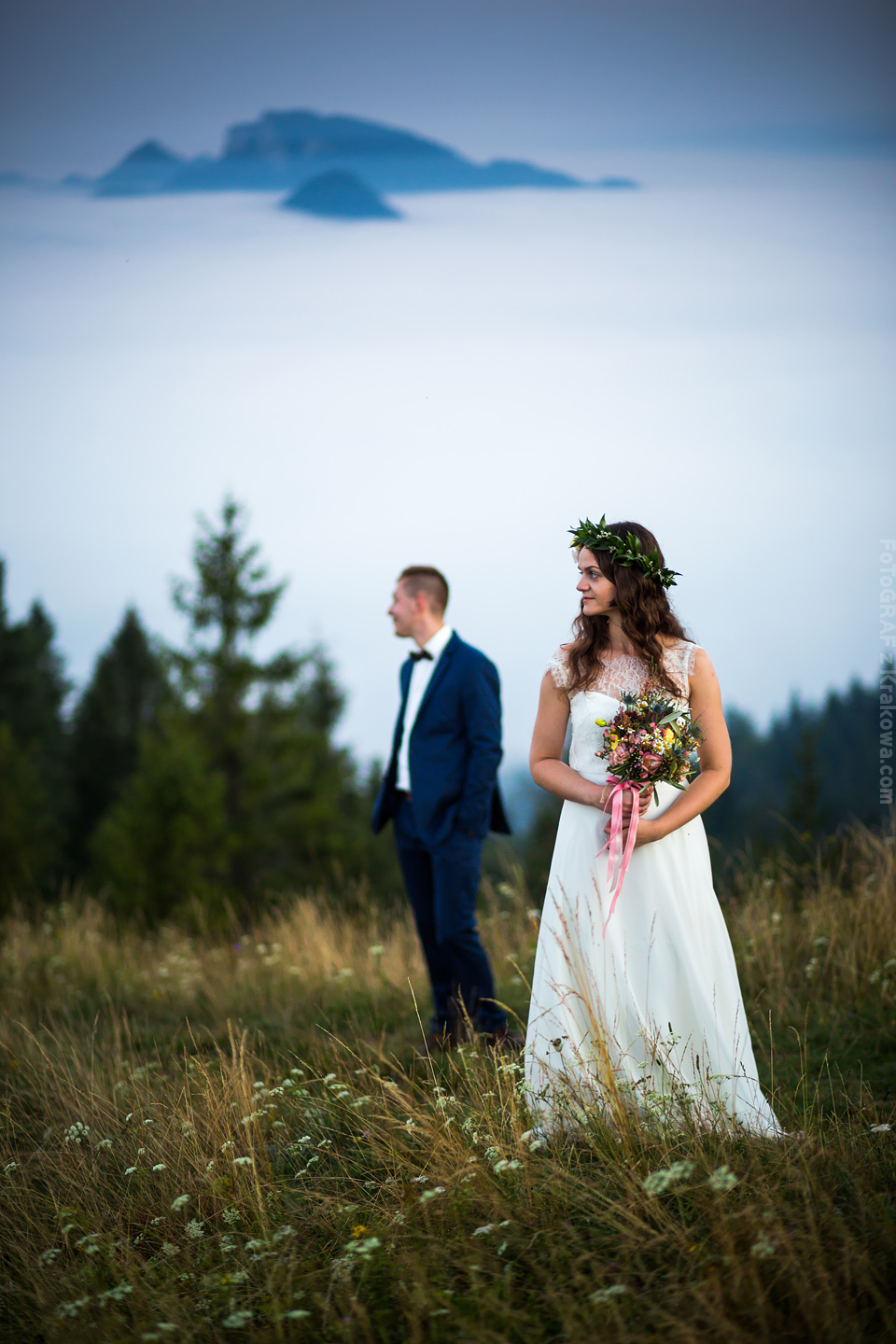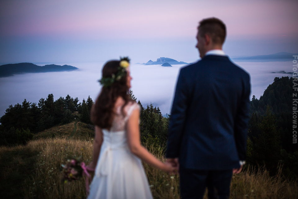 Chociaż mieszkają daleko od gór, od zawsze pragnęli mieć zdjęcia ślubne, właśnie w Karpatach. Gdy półtora roku temu Angelika i Bartek odezwali się do mnie właśnie z takim pomysłem, wiedziałem że to będzie niezwykła sesja. Jakoś tak po prostu czułem. Wiedziałem też, że tych dwoje zakochanych uwielbiają widoki w górach, dlatego czekało mnie tylko dobrać miejsce i czas. Z tym drugim byliśmy mocno ograniczeni, ponieważ musieliśmy się zgrać w czasie Ich podróży poślubnej na Podhalu. Żeby nie było tak łatwo, na te kilka dni przyszły afrykańskie upały i trzeba było rozpocząć plan B;) Zaproponowałem ,że dobrą opcją na upały 37 st’C, może być wschód słońca w górach… w zasadzie jedyną opcją… Szczerze nie spodziewałem się tak szybko pozytywnego smsa, a jednak! Pełen entuzjazmu, że może widoki dopiszą, pojechaliśmy o 1 w nocy w Pieniny. Gdzie po niedługiej wycieczce osiągnęliśmy szczyt o 4 nad ranem. O tej godzinie i tak było około 20st, dlatego pracowało się komfortowo. Widoki… światło, kolory… no i wreszcie Oni! Angelika i Bartek! 🙂 Nieco senni, zmęczeni ale zafascynowani widokami udało nam się sprawnie zrobić kilka zdjęć:) Serdeczne dzięki za pełne zaufanie!