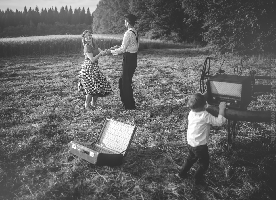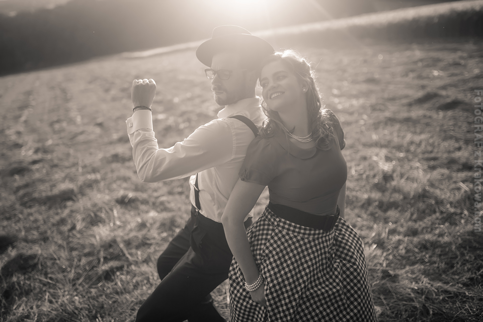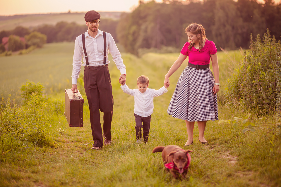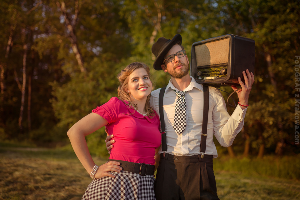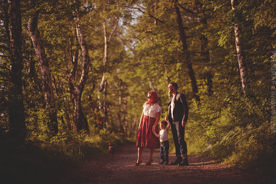 Ależ ja uwielbiam takich szaleńców! 🙂 Ale zacznijmy od początku: Pomysł na sesję vintage chodził za mną już troszkę czasu, jednak gdy zrobiło się zupełne lato jakoś wszystko się nagle zgrało: Kapitalna rodzinka, czas, pogoda, miejsce… Pomysł na taką sesję Lidka z Benkiem przyjęli od razu, a ich zaangażowanie przerosło moje oczekiwania już wtedy, gdy usłyszałem – Wiesz Kuba, my nie mamy ciuchów z lat 60. ale takie w stylu lat 50. się znajdą 😀 Już wtedy wiedziałem, że postarają się o stylizację na maksa! Mi pozostało znaleźć sielankowe miejsce i jaaaazda! Przedstawiam Wam Lidkę, Benka oraz ich przesłodkiego Tytusa! Ach, byłbym zapomniał – poznajcie również ich czworonoga Jaskra!