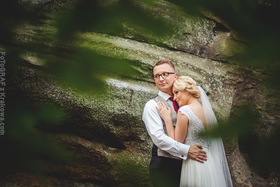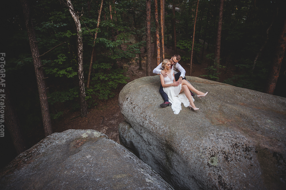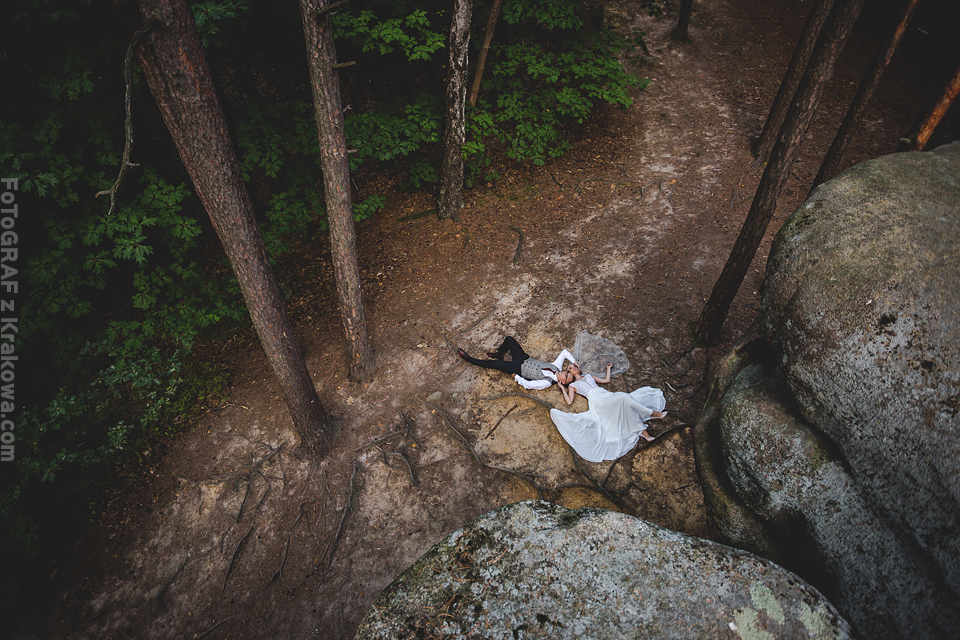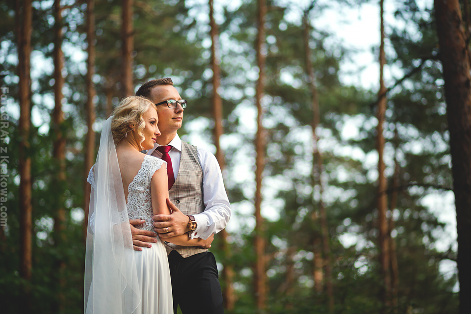 Czy można zrobić sesję ślubną … w rocznicę ślubu? Tak, można 🙂 Ta przesympatyczna para pokazała, że nigdy nie jest zbyt późno. Zaczęło się jednak oryginalną przygodą. Otóż zdjęcia miały być zupełnie gdzie indziej bo w starej stodole obok lasu. Jednak przygotowując miejsce na plener, przesuwaliśmy kilka gratów w których najwyraźniej było… gniazdo os. Natychmiast dostałem ostry strzał w szyję, a Jarek w czoło. Wybiegliśmy z wnętrza sycząc z bólu:D Udaliśmy się więc do pobliskiego lasu, a stodoła musi poczekać 😉