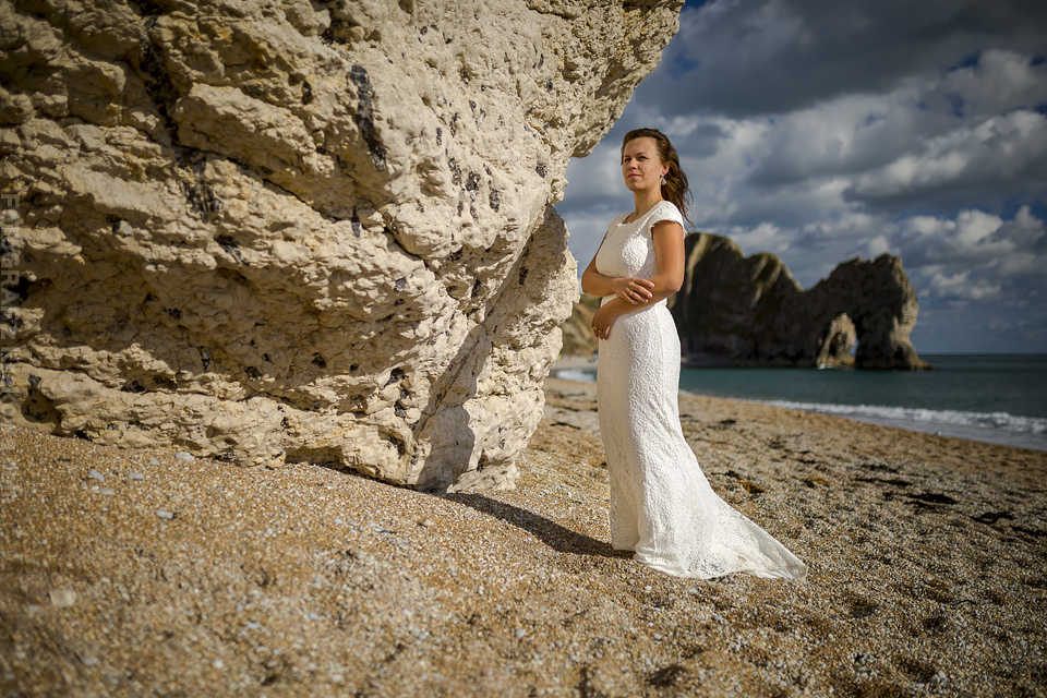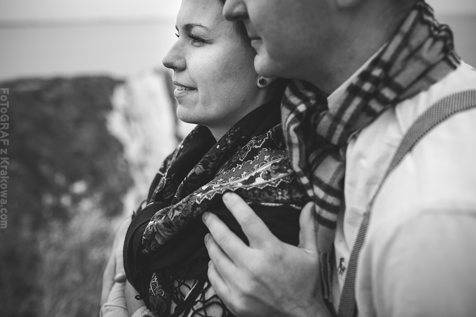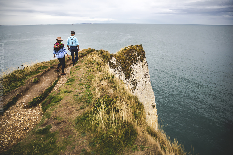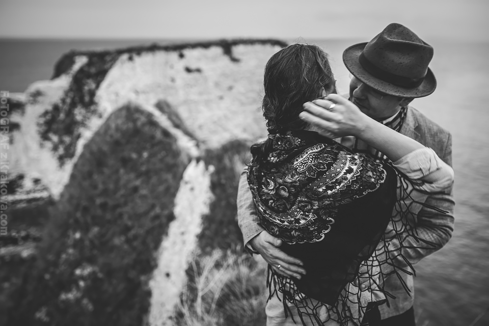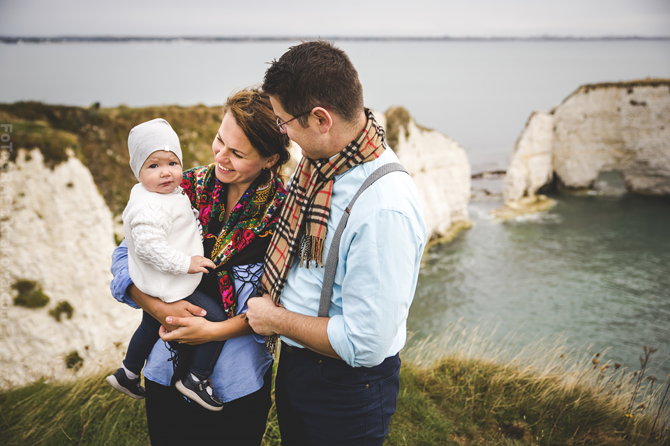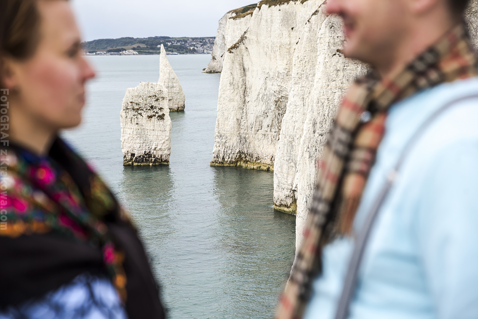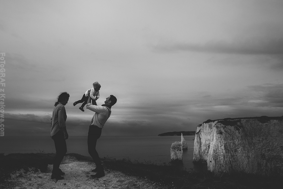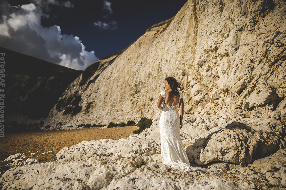 Jeszcze nie zdążyłem ochłonąć po plenerze w Szkocji a już musiałem pakować sprzęt na wyjazd do Anglii 🙂 Otóż Ania i Paweł mieszkają w Anglii i tylko drogą mailową mogliśmy ustalać najpierw szczegóły o ich ślubie a potem przyszedł temat pleneru. Przewijał się temat Krakowa i innych miejsc, ale szybko namówiłem ich, że zdjęcia możemy zrobić przecież u nich – w Anglii 🙂 Ania wysłała mi propozycje miejsc, które bez wahania zaakceptowałem – nadmorskie klify wydały mi się super tłem do takiego pleneru. Do Londynu przyleciałem wieczorem, znów Wyspy przywitały mnie niemal listopadową pogodą – strasznie wiało, a deszcz padał z każdej strony. Cała sesja została dostosowana do ich cudownej córeczki Sophie, pojechaliśmy z nią i z przyjaciółką Dorotką na południe – na klify. Tam dwa noclegi i dwa dni zdjęciowe. W pierwszy byliśmy zdani na okno pogodowe, które prognozy zapowiadały na rano. Faktycznie udało nam się w nie wstrzelić i nawet nie zmoknąć bardzo:) Pokusiliśmy się o inne ubrania niż ślubne tak by urozmaicić sesję. Dorotka w tym czasie dzielnie opiekowała się małą Sophie:) Koło 10 zaczęło padać już mocno. Na dzień następny prognozy wskazywały „sunny spell” a nawet na pełne słońce i na to bardzo liczyliśmy 🙂 Na sesję ślubną zostaliśmy już bez pomocy Dorotki, więc trzeba było to dobrze rozegrać, bo z malutkim dzieckiem nie wdrapiemy się wszędzie gdzie byśmy chcieli. Przeanalizowaliśmy mapy, zjedliśmy śniadanie i wyszło upragnione słońce 🙂 Na klify i kamienistą plażę niosłem wózek a na plechach sprzęt foto, Paweł trzymał Sophie, a Ania resztę rzeczy potrzebnych zarówno dla nas jak i córeczki. Na plaży często ciągnęliśmy wózek we dwójkę – w sypkich kamyczkach wózek grzązł co chwila:) Przerwa na karmienie – zdjęcie – przerwa na usypianie – zdjęcie – przerwa na jedzenie – zdjęcie – przerwa na zabawę – zdjęcie … Tak to w skrócie wyglądało 🙂 Szkoda, że nie miał kto nam zrobić „backstage’u” bo wyglądało to często tak, że bawiłem się z Sophie ustawiając w tym czasie modeli, albo Ania karmiła i usypiała a ja robiłem zdjęcia Pawłowi i na odwrót 🙂 Zapraszam do moich ulubionych zdjęć z tej sesji 🙂 Było to niebywale super doświadczenie!