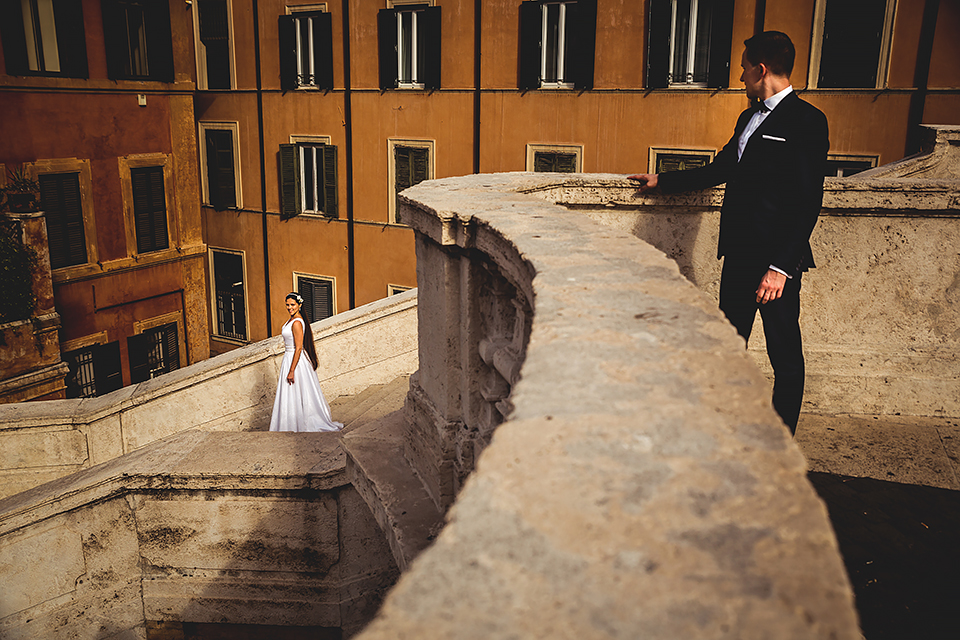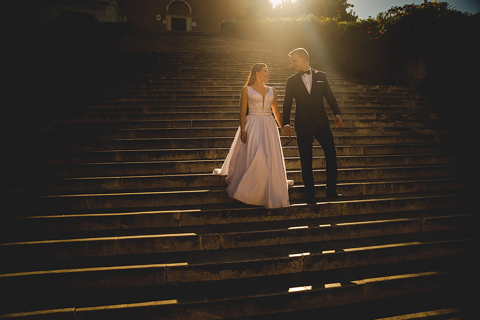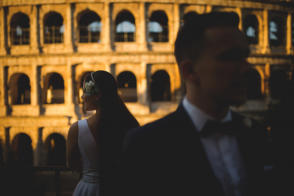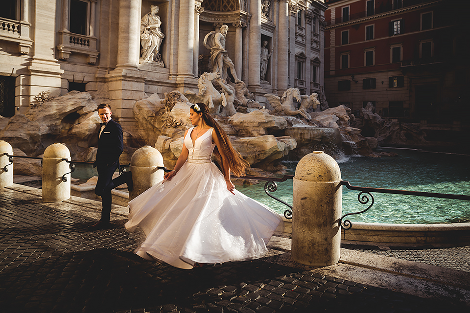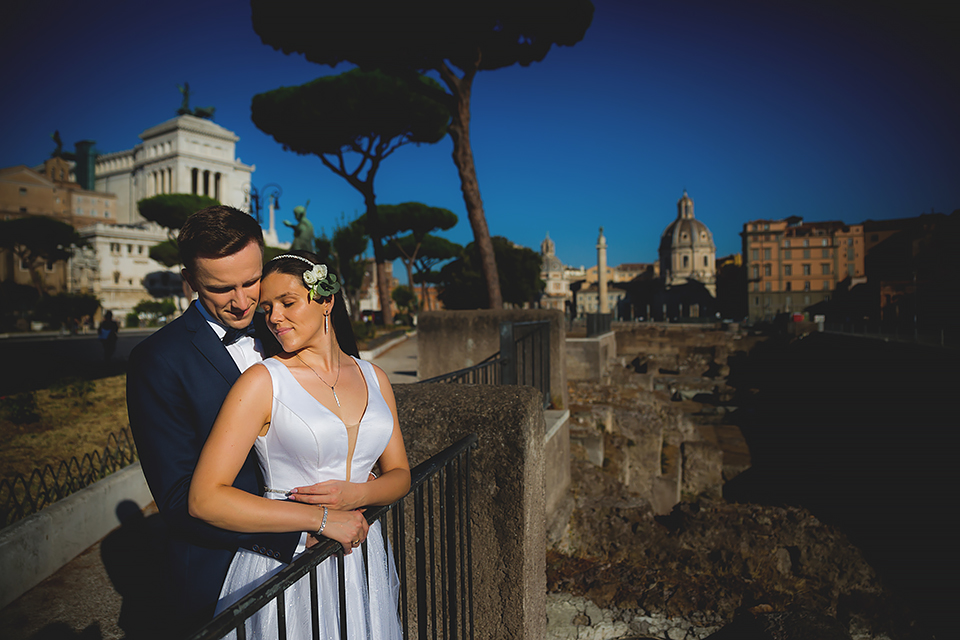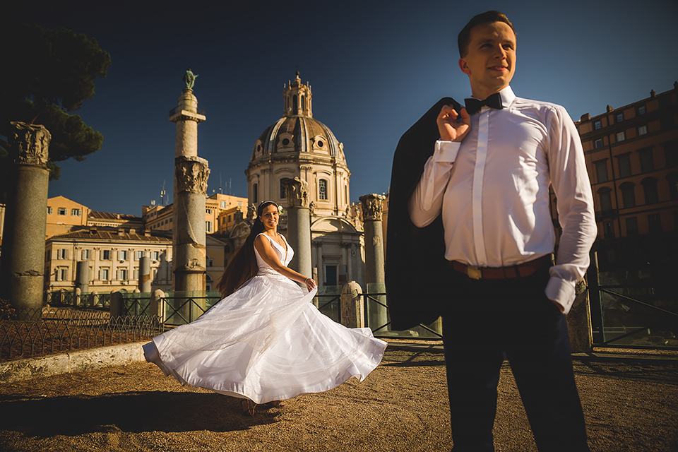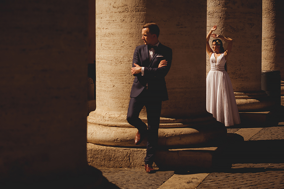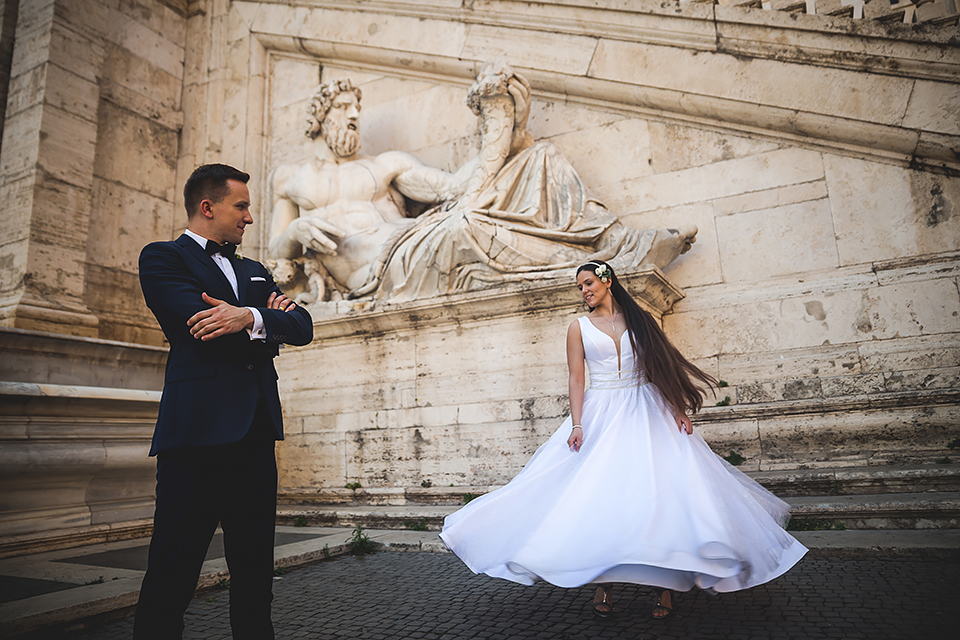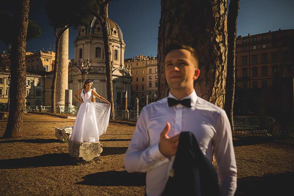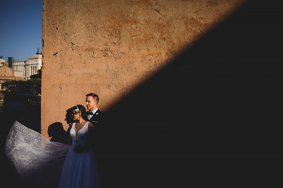 Wiosną kiedy lockdown uniemożliwił mi latanie na sesje zagraniczne, pogodziłem się że w tym roku raczej wszystkie sesje będą w Polsce;) Do czasu kiedy Asia i Kuba zaproponowali mi lot do Rzymu na ich poślubną sesje. W pierwszym momencie myślałem że absolutnie się nie zgodzę, ze strachu przed kwarantanną, zamknięciem granic, lotów… a wesel teraz dużo i nie mógłbym sobie pozwolić na takie ryzyko. Jednak przedyskutowaliśmy wszystkie za i przeciw i padła decyzja na TAK:) Jako człowiek kochający jesień i zimę i tolerujący temperaturę max 20st C, musiałem się zmierzyć z włoskim upałem 34st. … i to po raz drugi 😀 Jednak absolutnie ciekawe i pozytywne była nadzwyczaj mała liczba ludzi, którą obserwowaliśmy na kamerach internetowych będąc już na lotnisku. Rzeczywiście! Pod Coloseum nikogo, na Schodach Hiszpańskich pusto, pod Fontanną Di Trevi garstka turystów… Było to mimo wszystko zaskakujące… Asia była już kiedyś w tym mieście, ja w Rzymie byłem 3 lata temu i pamiętamy te tłumy. A teraz Rzym był cały dla nas:) Asia i Kuba kapitalnie znieśli trudy sesji, bo jednak sukienka i garnitur nie należą do przewiewnych ubrań:) Brawo dla Was! Dzięki serdeczne za wszystko:)