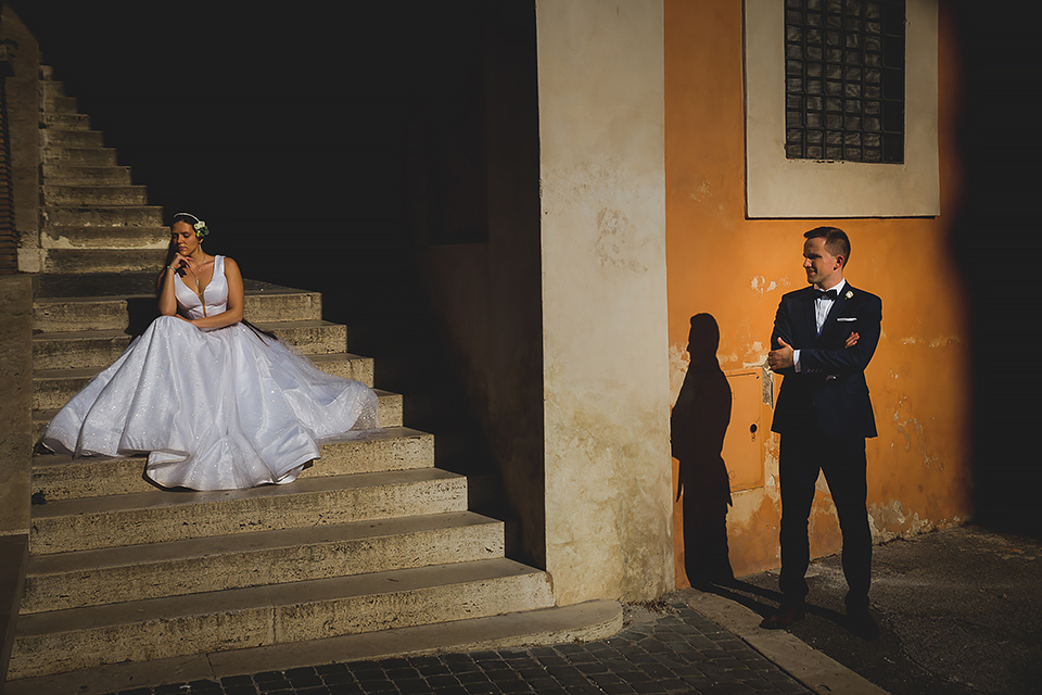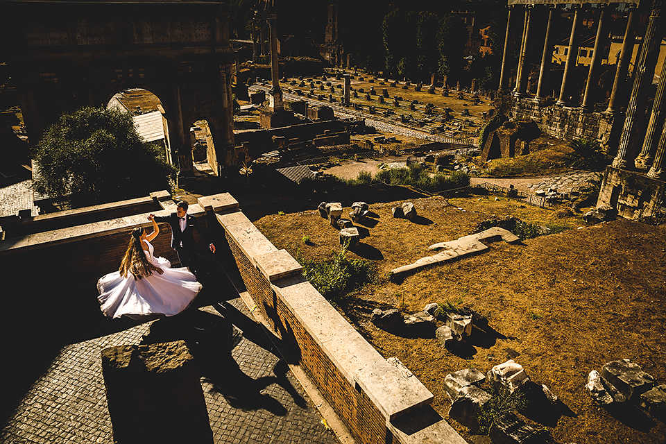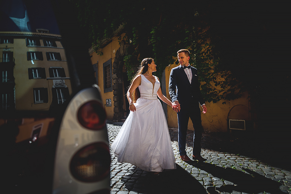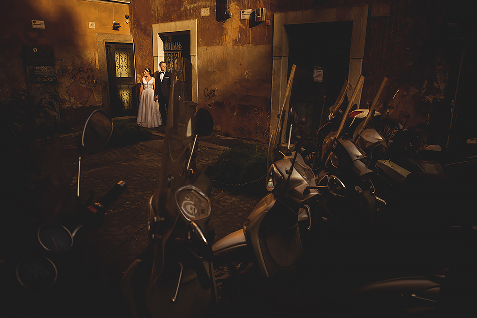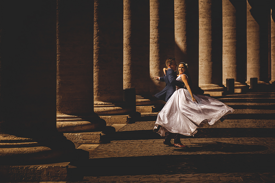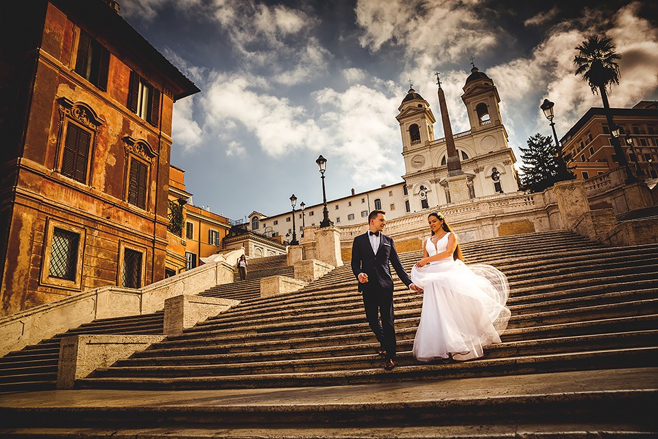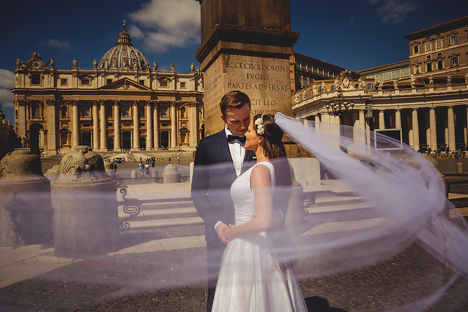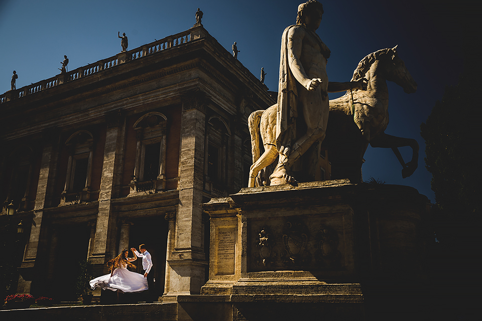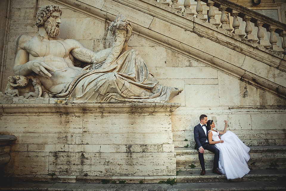 Wiosną kiedy lockdown uniemożliwił mi latanie na sesje zagraniczne, pogodziłem się że w tym roku raczej wszystkie sesje będą w Polsce;) Do czasu kiedy Asia i Kuba zaproponowali mi lot do Rzymu na ich poślubną sesje. W pierwszym momencie myślałem że absolutnie się nie zgodzę, ze strachu przed kwarantanną, zamknięciem granic, lotów… a wesel teraz dużo i nie mógłbym sobie pozwolić na takie ryzyko. Jednak przedyskutowaliśmy wszystkie za i przeciw i padła decyzja na TAK:) Jako człowiek kochający jesień i zimę i tolerujący temperaturę max 20st C, musiałem się zmierzyć z włoskim upałem 34st. … i to po raz drugi 😀 Jednak absolutnie ciekawe i pozytywne była nadzwyczaj mała liczba ludzi, którą obserwowaliśmy na kamerach internetowych będąc już na lotnisku. Rzeczywiście! Pod Coloseum nikogo, na Schodach Hiszpańskich pusto, pod Fontanną Di Trevi garstka turystów… Było to mimo wszystko zaskakujące… Asia była już kiedyś w tym mieście, ja w Rzymie byłem 3 lata temu i pamiętamy te tłumy. A teraz Rzym był cały dla nas:) Asia i Kuba kapitalnie znieśli trudy sesji, bo jednak sukienka i garnitur nie należą do przewiewnych ubrań:) Brawo dla Was! Dzięki serdeczne za wszystko:)