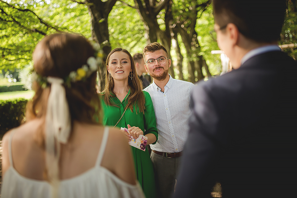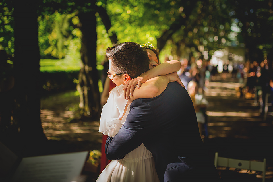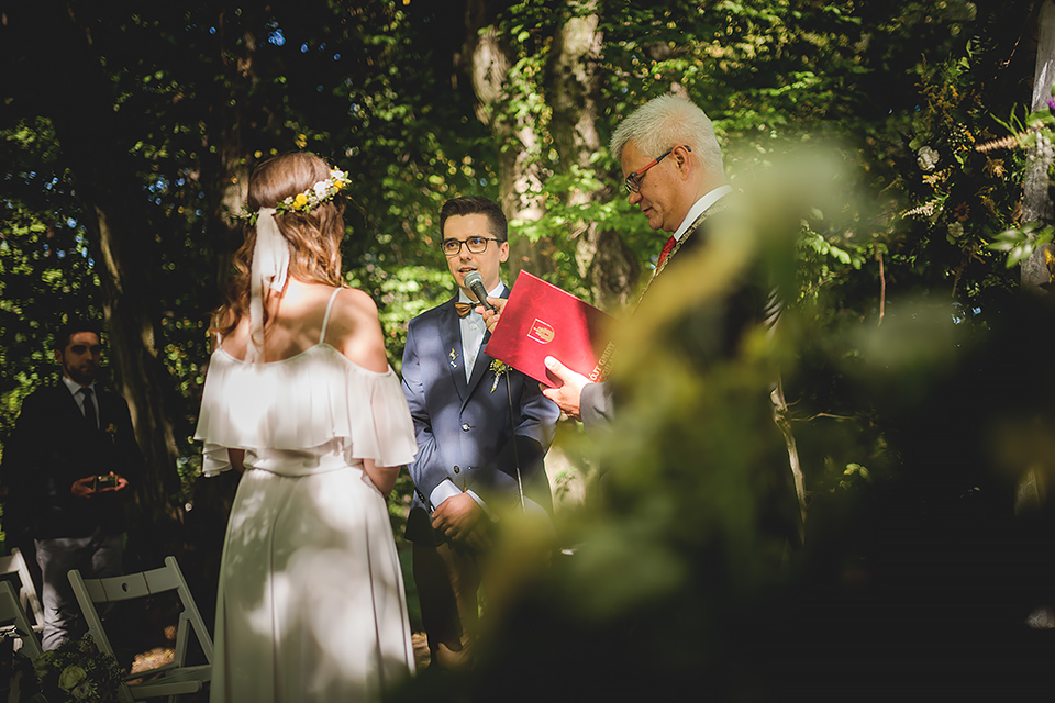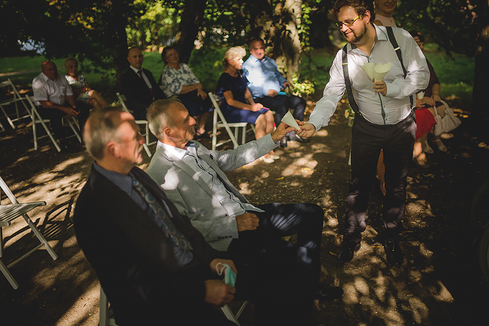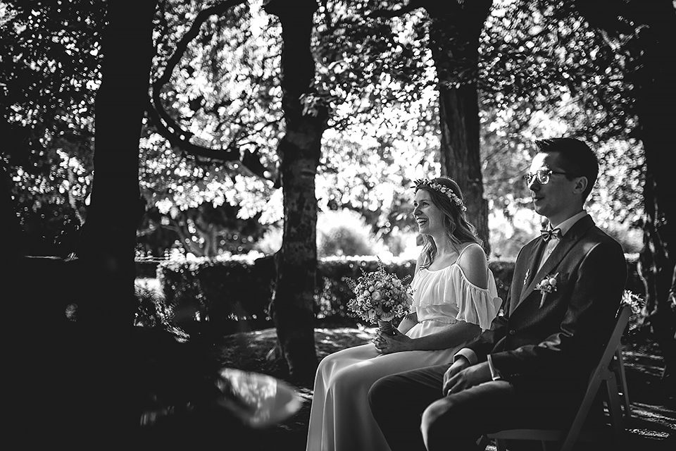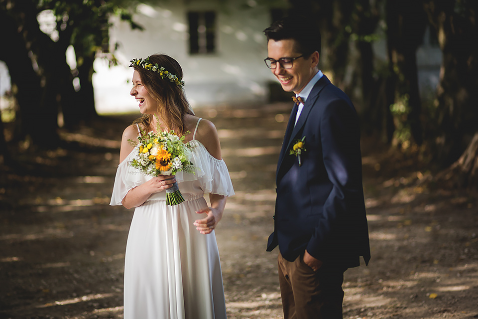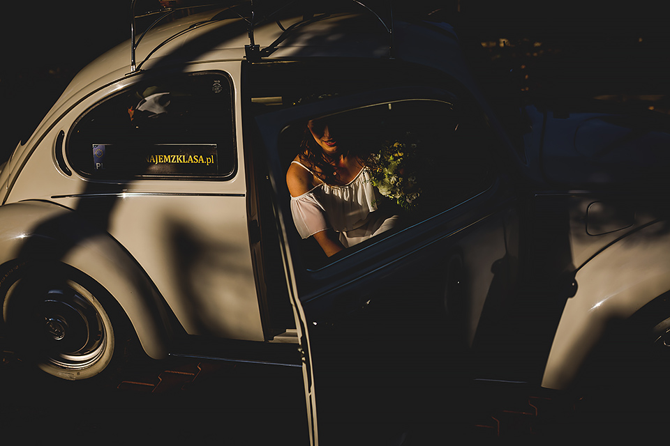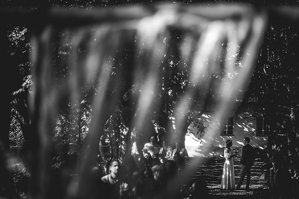 Na ten dzień czekałem z niecierpliwieniem;) Wiedziałem, że będzie oryginalnie więc pozostało trzymać mocno kciuki za pogodę! Ufff, nastał piękny i słoneczny dzień – idealnie na plenerowy ślub!… Jakimś cudem udało się wyprasować sukienkę, udało się też skombinować nagłośnienie na uroczystość (brawo Just!;). Maciek w między czasie miał lekcję jazdy starym samochodem, a Sylwia bardzo nie chciała makijażu, więc kompromisem kilka pociągnięć tuszem wystarczyło;) Klepsydra zaczęła odliczać czas, a więc w droge! Kapitalna aleja grabowa w Mogilanach i wystrój miejsca ceremonii wprost zwalał z nóg – ależ ładnie! Rozmowy z gośćmi, ostatnia próba mikrofonu i za kilka chwil było wielkie Taaaaak! Usmiechy, ryż, życzenia w cieniu starych drzew i można było jechać na imprezkę;) Na miejscu czekała już niezastąpiona grupa BrosArt , dzięki której parkiet wirował pełen gości do późnych godzin;)… Niech resztę opowiedzą zdjęcia…. te moje wybrane, ulubione. Na początek kilka zdjęć z pleneru