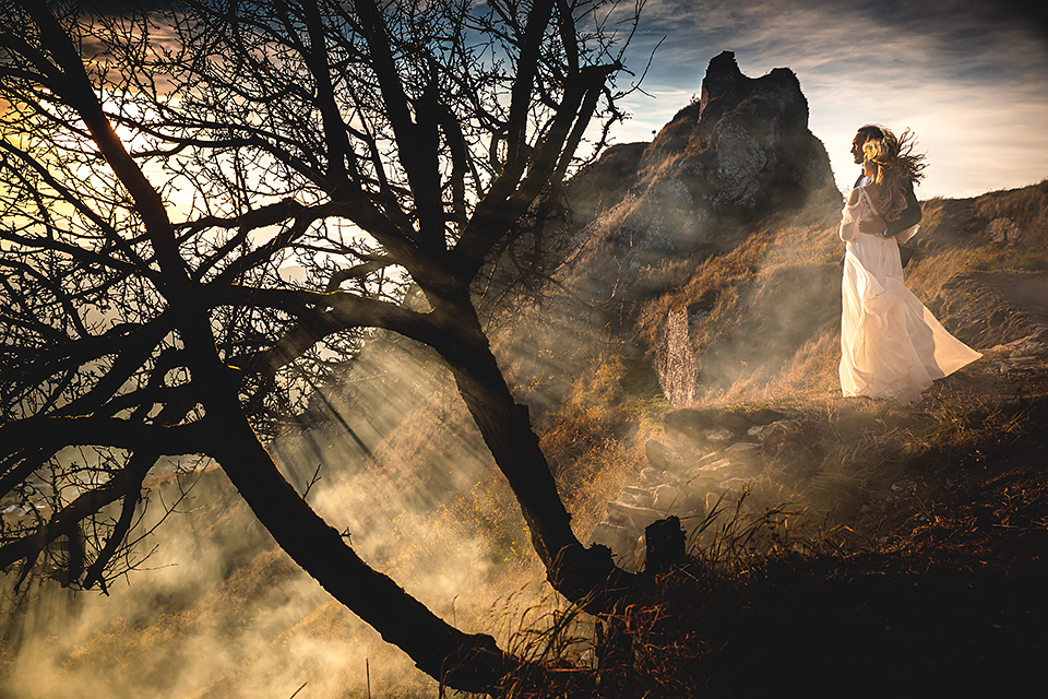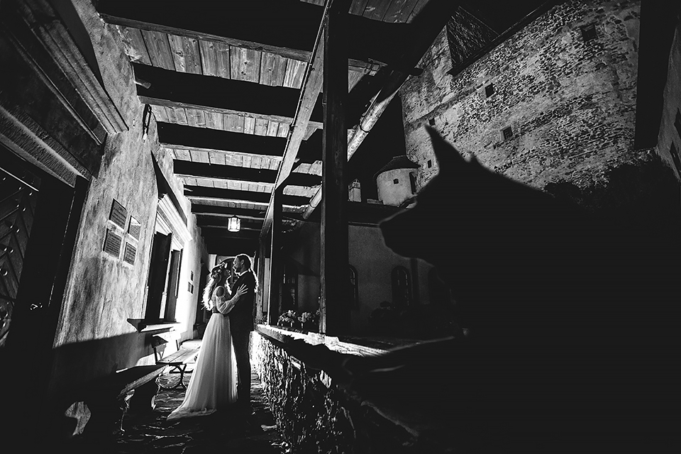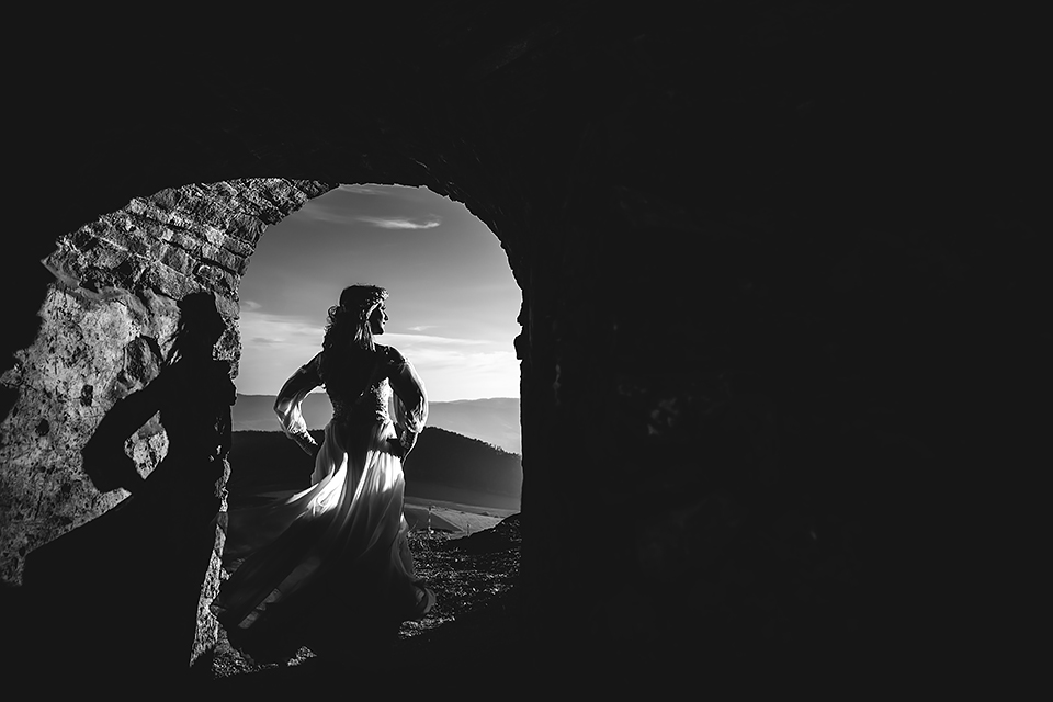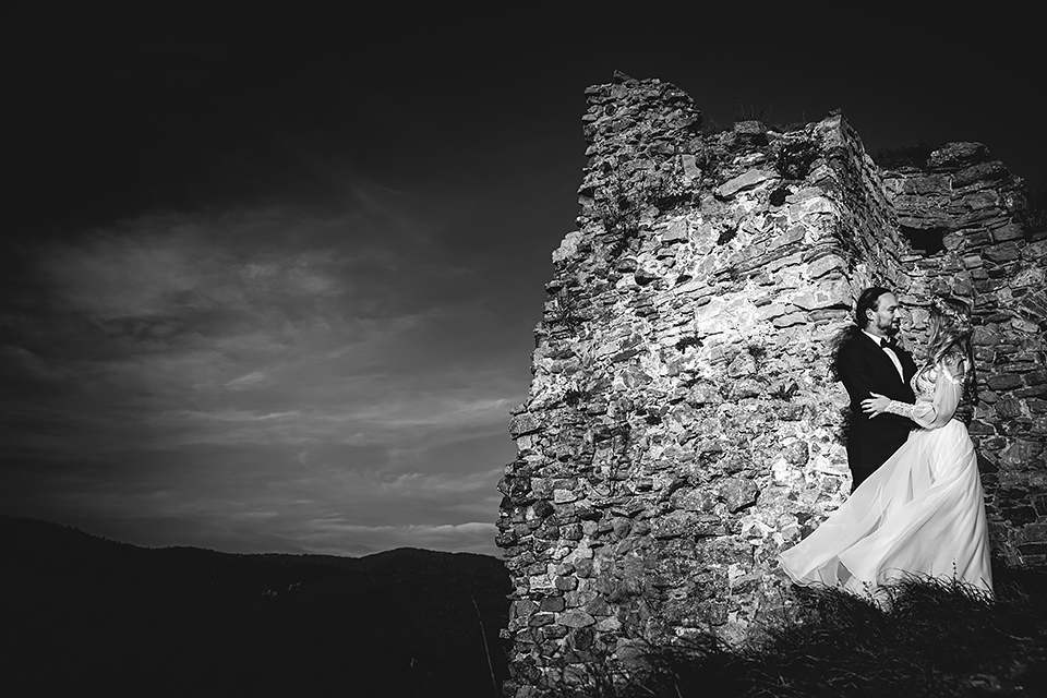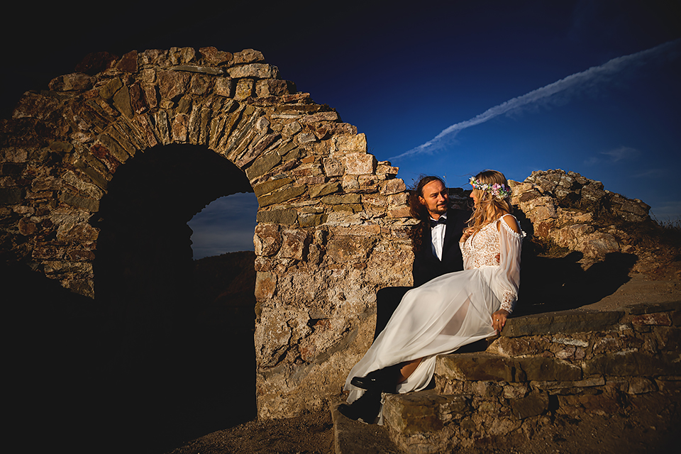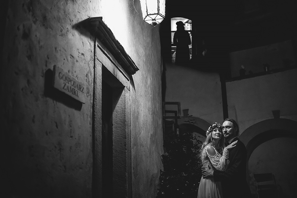 2. Bohaterowie obydwu tych sesji – wymyśleli że w dniu ślubu skorzystają z tego, że udostępniono im zamek w Niedzicy i wzięli mnie tam na nocne zdjęcia w tym pustym i cichym zamczysku… Podobnie jak ja, Maciek i Magda poruszają się w kręgach muzyki metalowej, dlatego też te sesję postanowiłem zrobić nieco mroczną i tajemniczą. Wszak była już noc, na zamku nie było nikogo… a może jednak ktoś był ? Legenda bowiem mówi, że wiele lat temu nieszczęśliwie zakończyło się książęce małżeństwo. Podczas jednej z kłótni rozlała się krew…. Wiele lat później, mieszkańcy zamku zaczęli opowiadać, że nocami po dziedzińcu warowni snuje się duch księcia… Każdej nocy spotyka on swoją zmarłą małżonkę i obie mary już pogodzone wędrują po zamku… Kilka tych zdjęć na zamku postanowiłem właśnie nawiązać do tej legendy, by nie było zbyt słodko 🙂 Wykorzystałem tutaj swoje umiejętności graficzne i większość z tych kadrów jest mocno odjechana. Spróbujcie się wpatrzeć nieco dłużej a na pewno dostrzeżecie tam nieco więcej 🙂