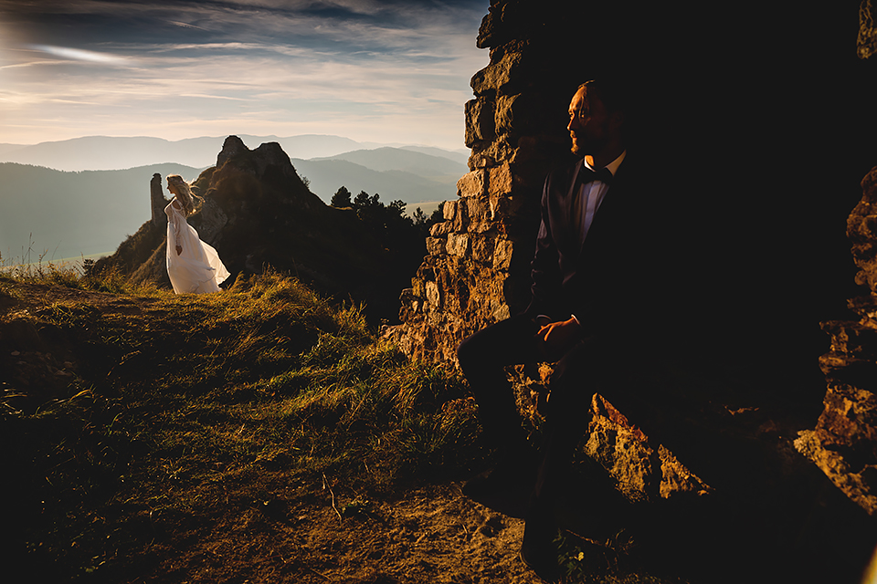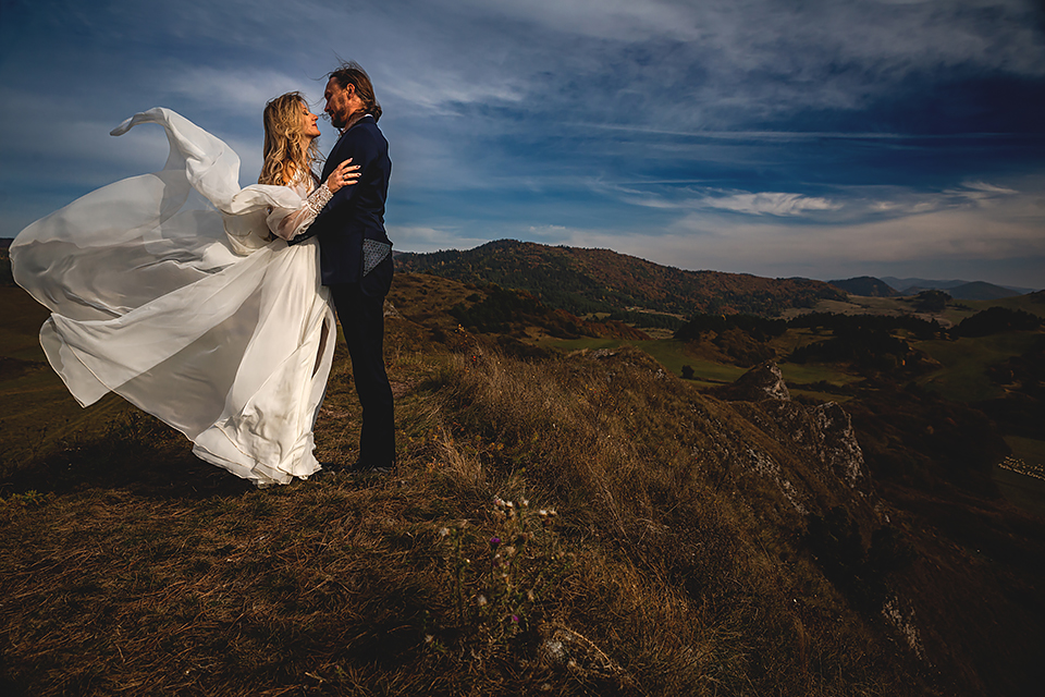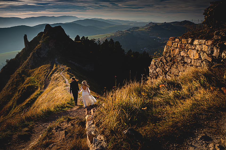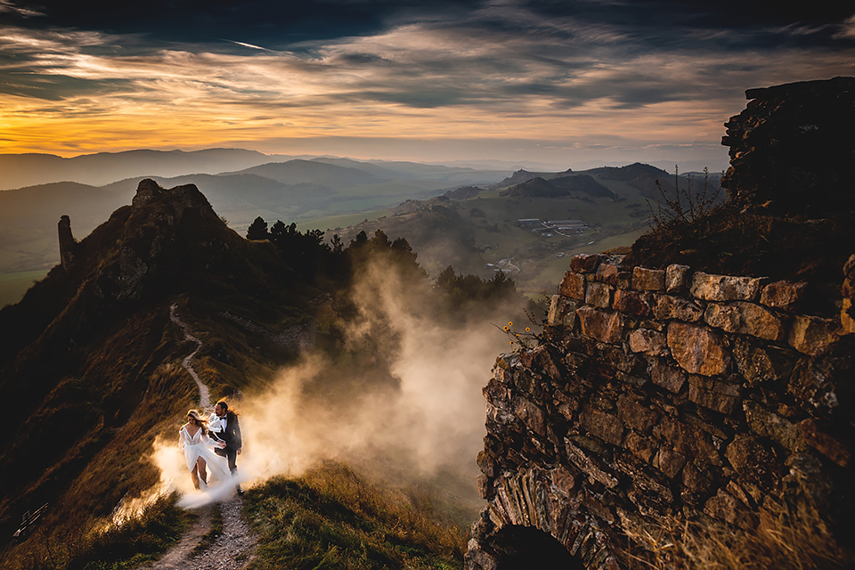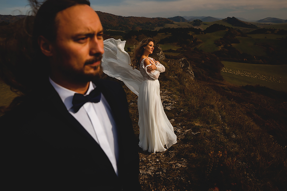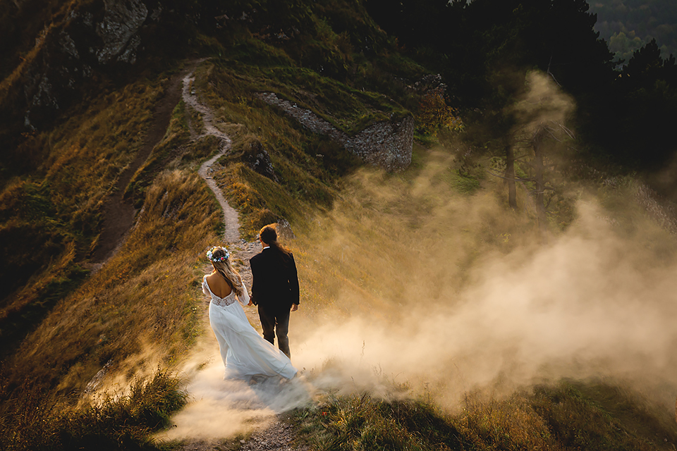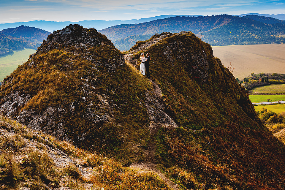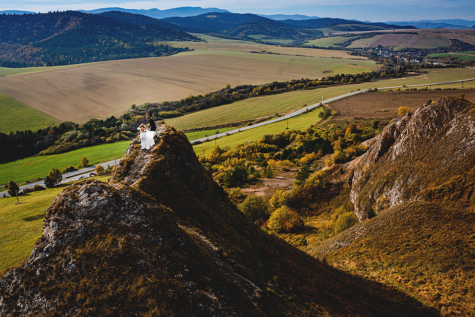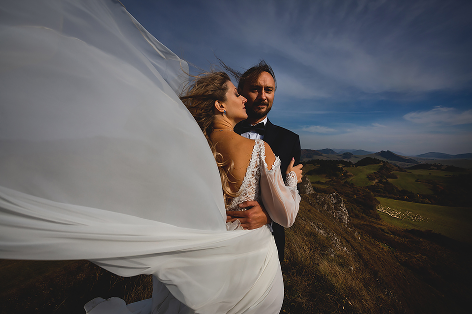 1. Słowacja to niezwykle piękna kraina. Wystarczy wsiąść w auto i co chwilę można zatrzymywać się podziwiając niesamowite miejsca. Na Słowacji robiłem już sporo sesji ślubnych, ale za każdym razem jest to coś wyjątkowego. Zazwyczaj miejsca wybieram osobiście, ale tutaj było łatwiej;) Ponieważ M&M bardzo często podróżują u naszych południowych sąsiadów i poznali już wiele znakomitych zakątków. Wybór nie był łatwy, ale padło na miejsca mniej znane, ukryte przed tłumem turystów a tym bardziej przed Parami Młodymi :)I tak podążyliśmy szlakiem wąwozów, skał i zamków… których tutaj nie brakuje. Bardzo mocny wiatr nie ułatwiał sprawy, ale czasem też pomagał. Mogłem uzyskać bardzo ciekawe i zwiewne efekty. Od razu wyjaśniam, że zdjęcia „z góry” w wąwozie nie są robione z drona. Strome ścieżki pozwalają uzyskać ciekawe efekty „z lotu ptaka”… Koncepcja sesji miała zawierać element drogi, szerokie widoki z elementem „ludzkim”, uczucie:) oraz świece dymne.