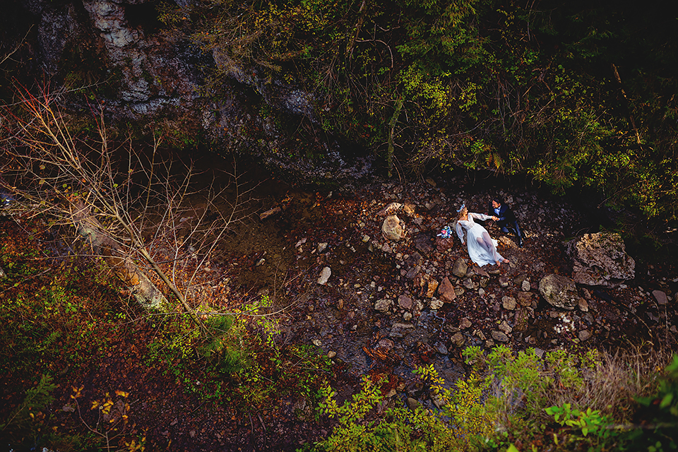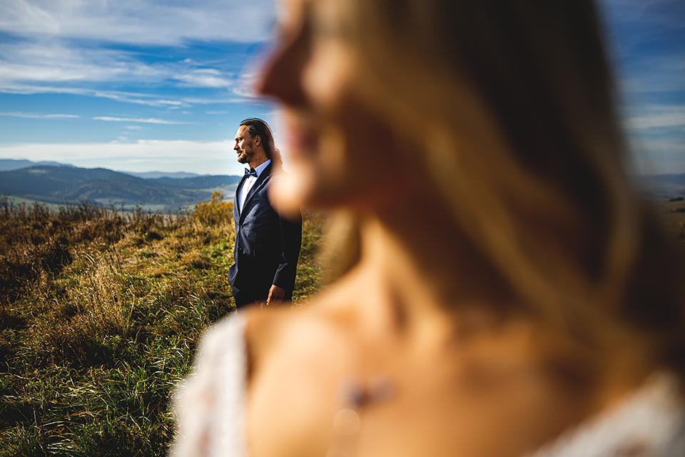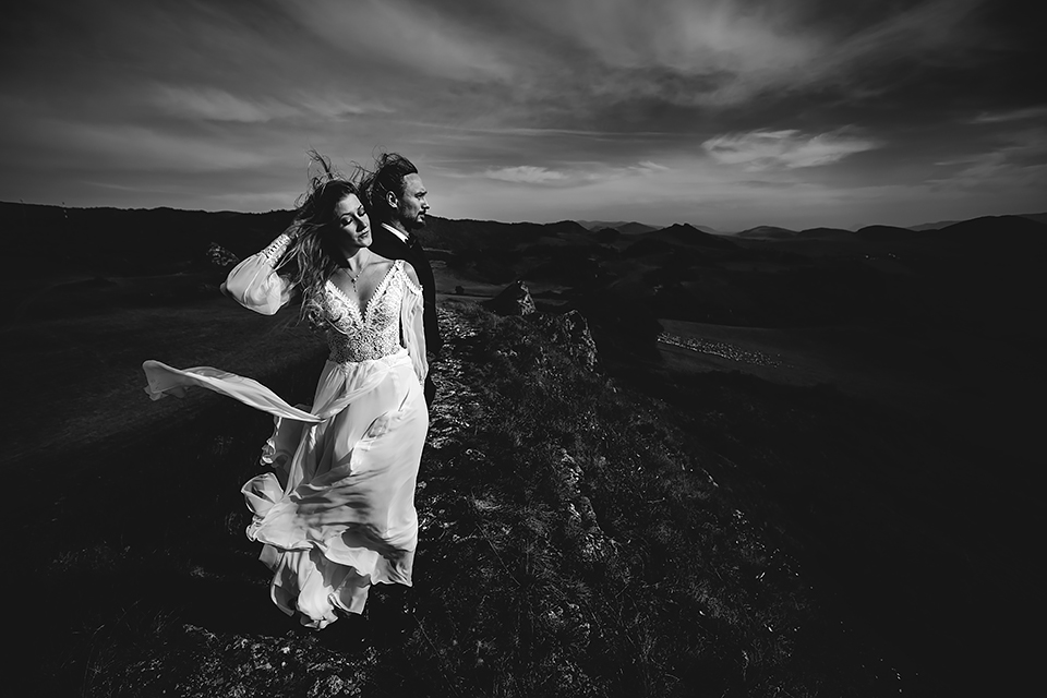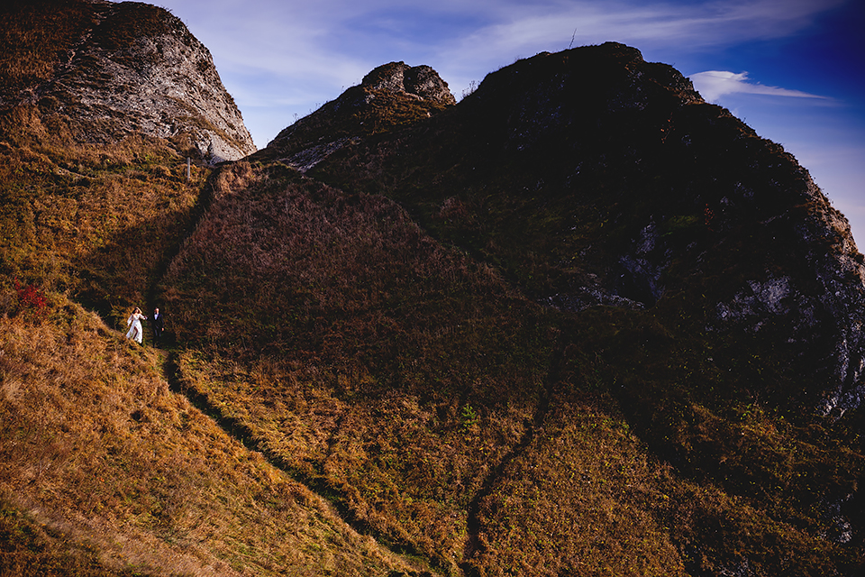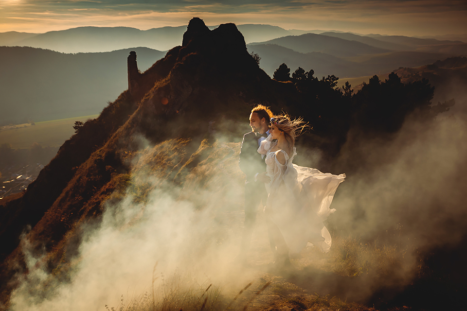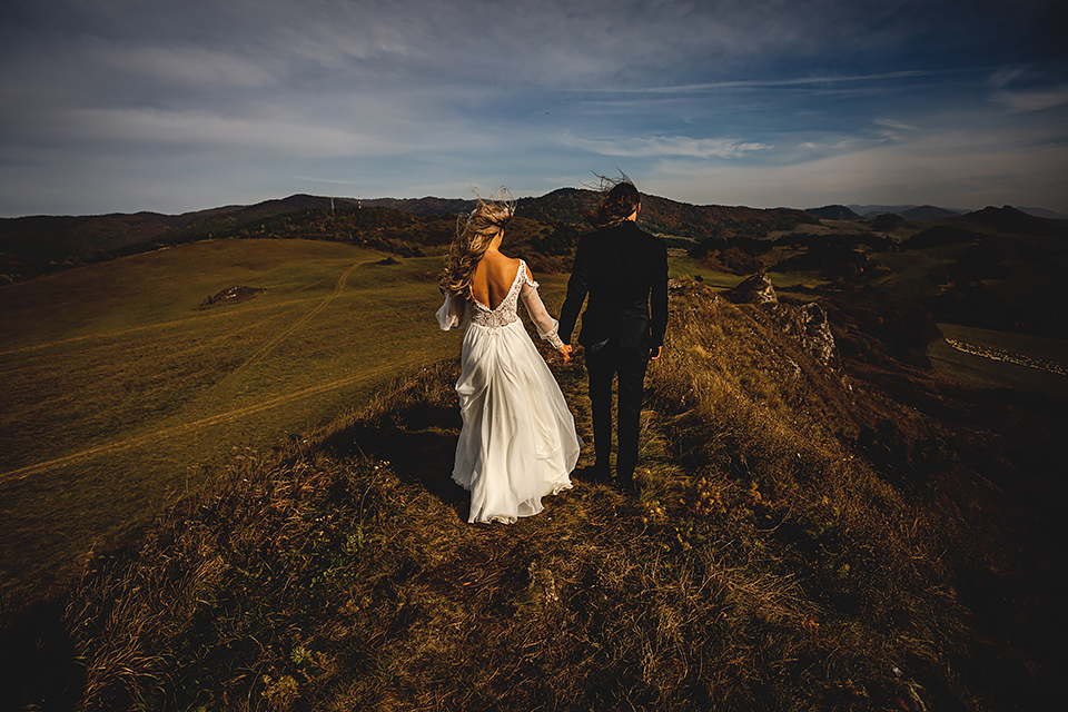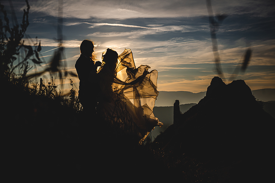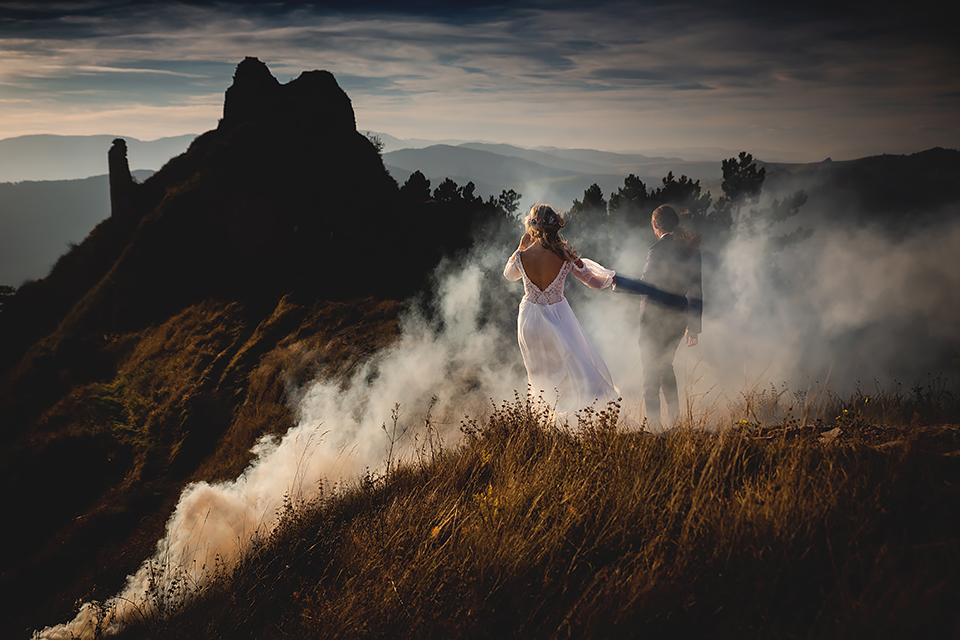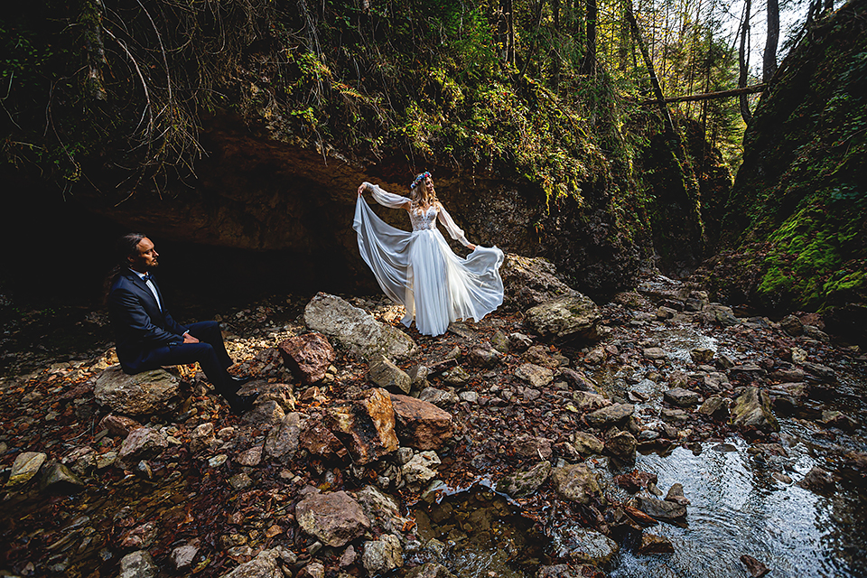 1. Słowacja to niezwykle piękna kraina. Wystarczy wsiąść w auto i co chwilę można zatrzymywać się podziwiając niesamowite miejsca. Na Słowacji robiłem już sporo sesji ślubnych, ale za każdym razem jest to coś wyjątkowego. Zazwyczaj miejsca wybieram osobiście, ale tutaj było łatwiej;) Ponieważ M&M bardzo często podróżują u naszych południowych sąsiadów i poznali już wiele znakomitych zakątków. Wybór nie był łatwy, ale padło na miejsca mniej znane, ukryte przed tłumem turystów a tym bardziej przed Parami Młodymi :)I tak podążyliśmy szlakiem wąwozów, skał i zamków… których tutaj nie brakuje. Bardzo mocny wiatr nie ułatwiał sprawy, ale czasem też pomagał. Mogłem uzyskać bardzo ciekawe i zwiewne efekty. Od razu wyjaśniam, że zdjęcia „z góry” w wąwozie nie są robione z drona. Strome ścieżki pozwalają uzyskać ciekawe efekty „z lotu ptaka”… Koncepcja sesji miała zawierać element drogi, szerokie widoki z elementem „ludzkim”, uczucie:) oraz świece dymne.