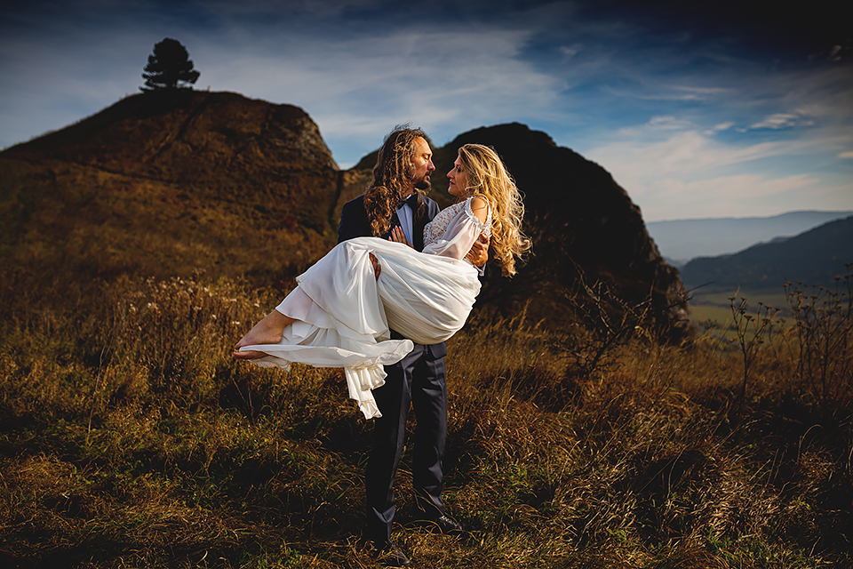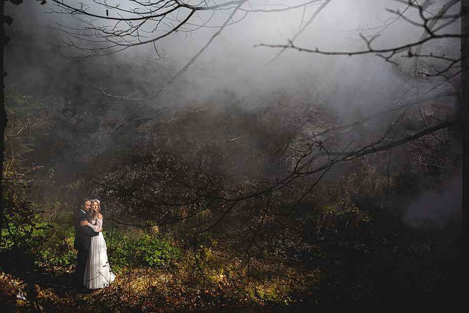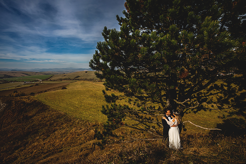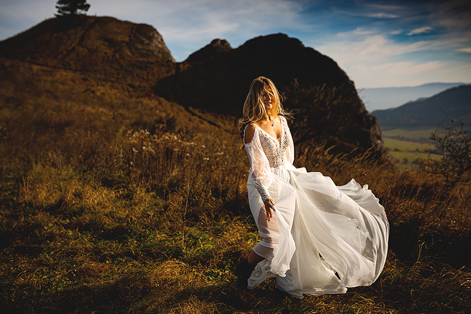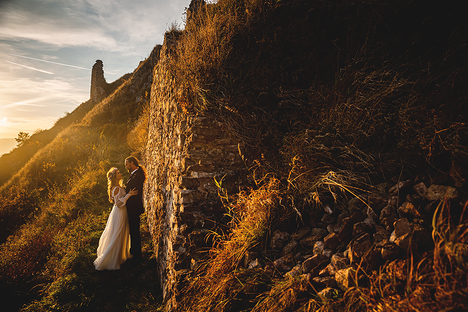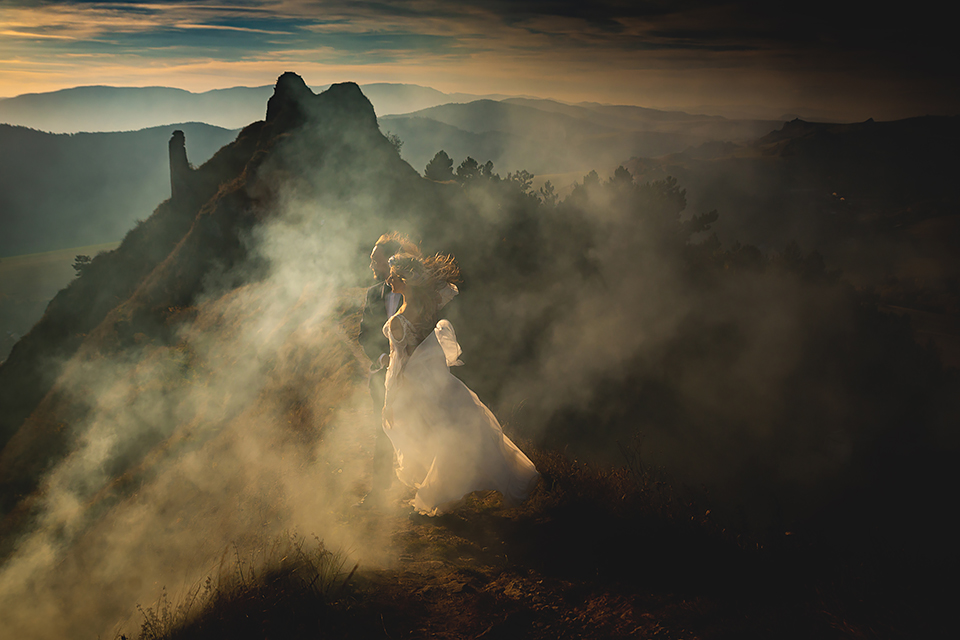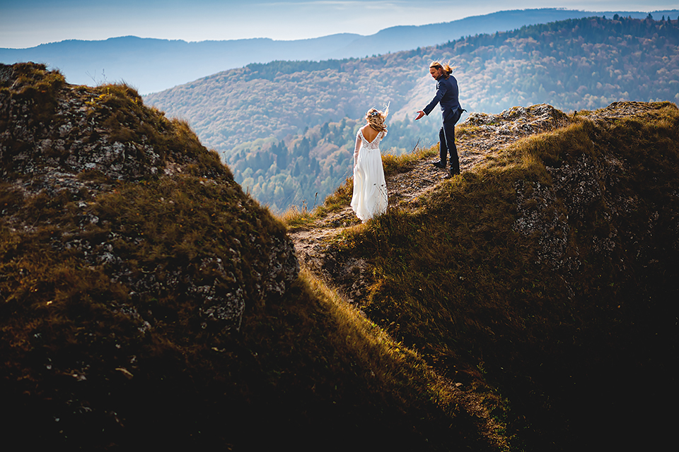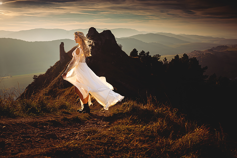 1. Słowacja to niezwykle piękna kraina. Wystarczy wsiąść w auto i co chwilę można zatrzymywać się podziwiając niesamowite miejsca. Na Słowacji robiłem już sporo sesji ślubnych, ale za każdym razem jest to coś wyjątkowego. Zazwyczaj miejsca wybieram osobiście, ale tutaj było łatwiej;) Ponieważ M&M bardzo często podróżują u naszych południowych sąsiadów i poznali już wiele znakomitych zakątków. Wybór nie był łatwy, ale padło na miejsca mniej znane, ukryte przed tłumem turystów a tym bardziej przed Parami Młodymi :)I tak podążyliśmy szlakiem wąwozów, skał i zamków… których tutaj nie brakuje. Bardzo mocny wiatr nie ułatwiał sprawy, ale czasem też pomagał. Mogłem uzyskać bardzo ciekawe i zwiewne efekty. Od razu wyjaśniam, że zdjęcia „z góry” w wąwozie nie są robione z drona. Strome ścieżki pozwalają uzyskać ciekawe efekty „z lotu ptaka”… Koncepcja sesji miała zawierać element drogi, szerokie widoki z elementem „ludzkim”, uczucie:) oraz świece dymne.