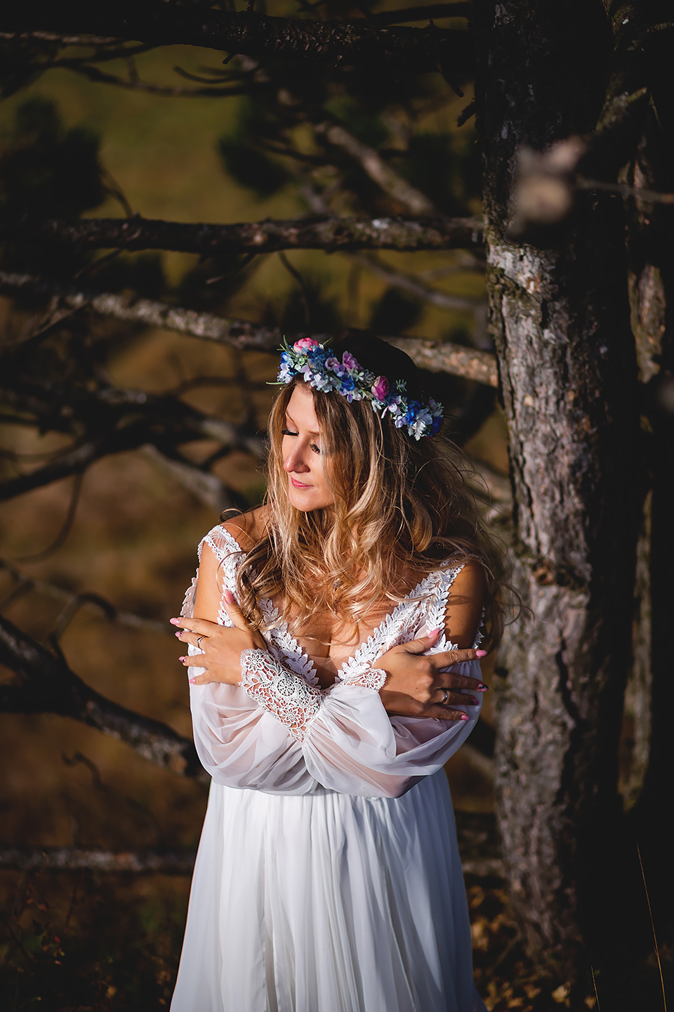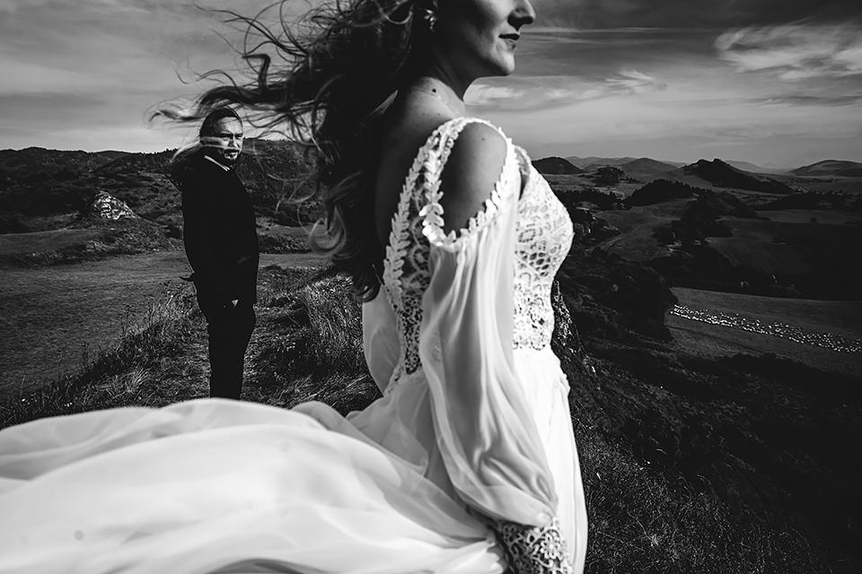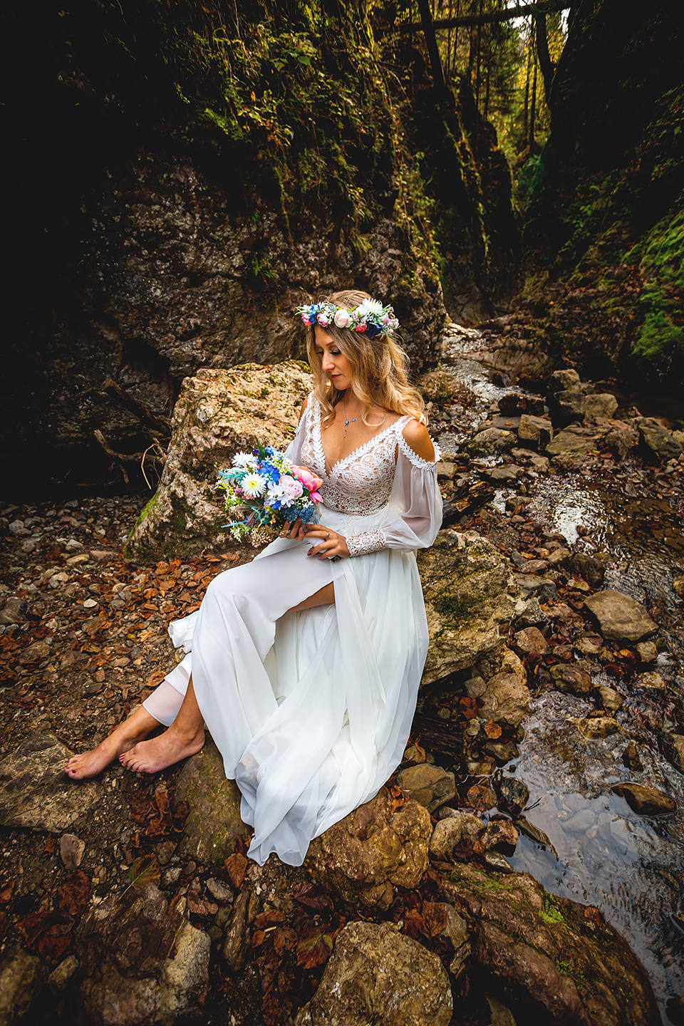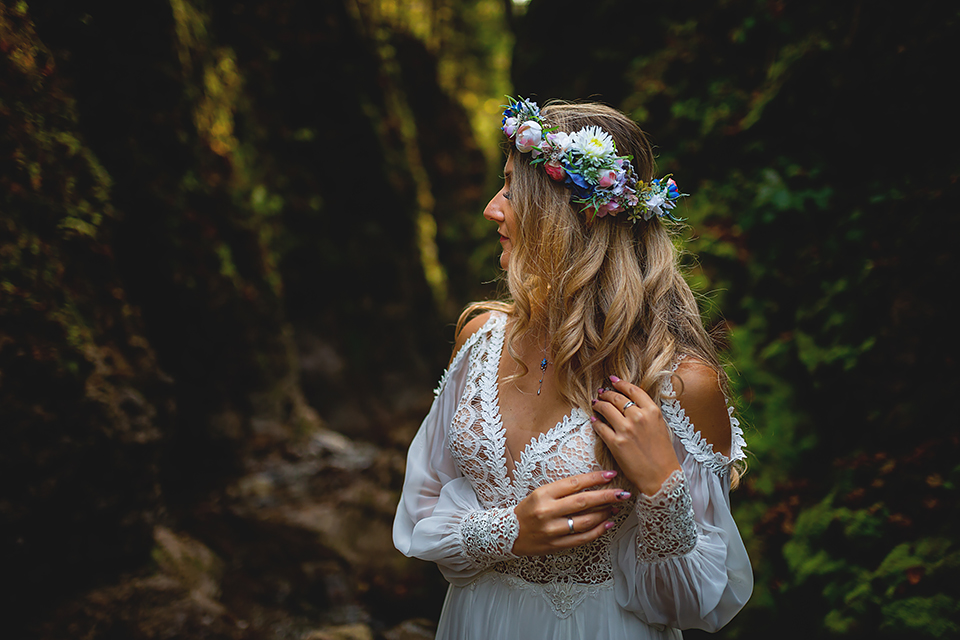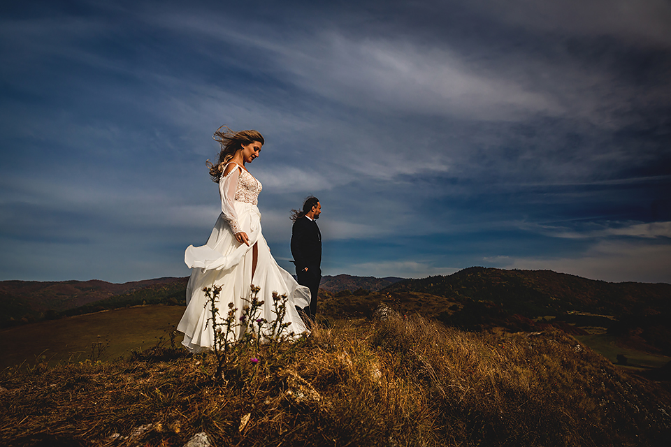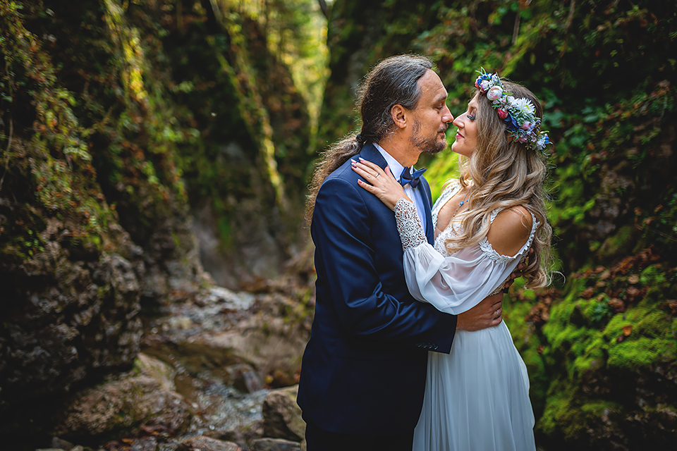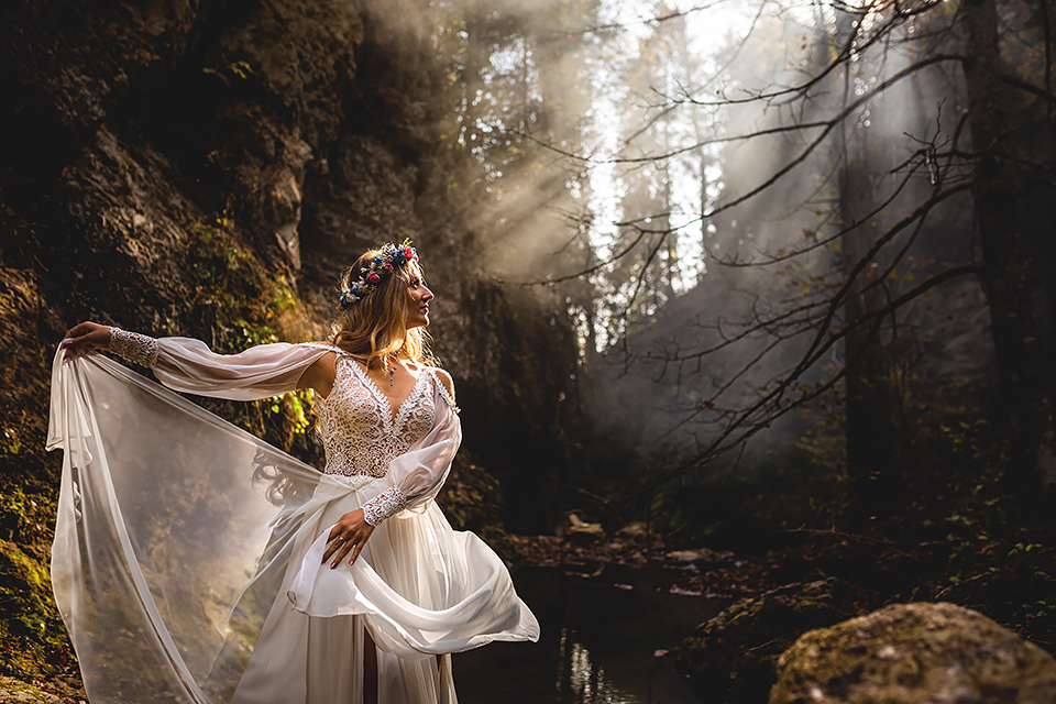 1. Słowacja to niezwykle piękna kraina. Wystarczy wsiąść w auto i co chwilę można zatrzymywać się podziwiając niesamowite miejsca. Na Słowacji robiłem już sporo sesji ślubnych, ale za każdym razem jest to coś wyjątkowego. Zazwyczaj miejsca wybieram osobiście, ale tutaj było łatwiej;) Ponieważ M&M bardzo często podróżują u naszych południowych sąsiadów i poznali już wiele znakomitych zakątków. Wybór nie był łatwy, ale padło na miejsca mniej znane, ukryte przed tłumem turystów a tym bardziej przed Parami Młodymi :)I tak podążyliśmy szlakiem wąwozów, skał i zamków… których tutaj nie brakuje. Bardzo mocny wiatr nie ułatwiał sprawy, ale czasem też pomagał. Mogłem uzyskać bardzo ciekawe i zwiewne efekty. Od razu wyjaśniam, że zdjęcia „z góry” w wąwozie nie są robione z drona. Strome ścieżki pozwalają uzyskać ciekawe efekty „z lotu ptaka”… Koncepcja sesji miała zawierać element drogi, szerokie widoki z elementem „ludzkim”, uczucie:) oraz świece dymne.