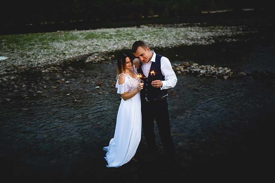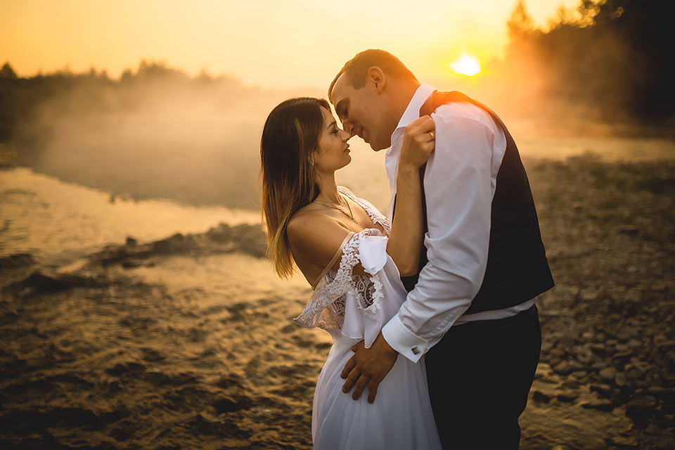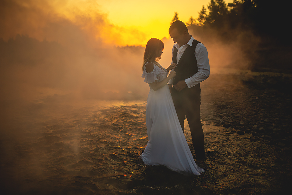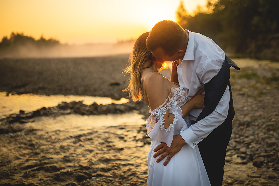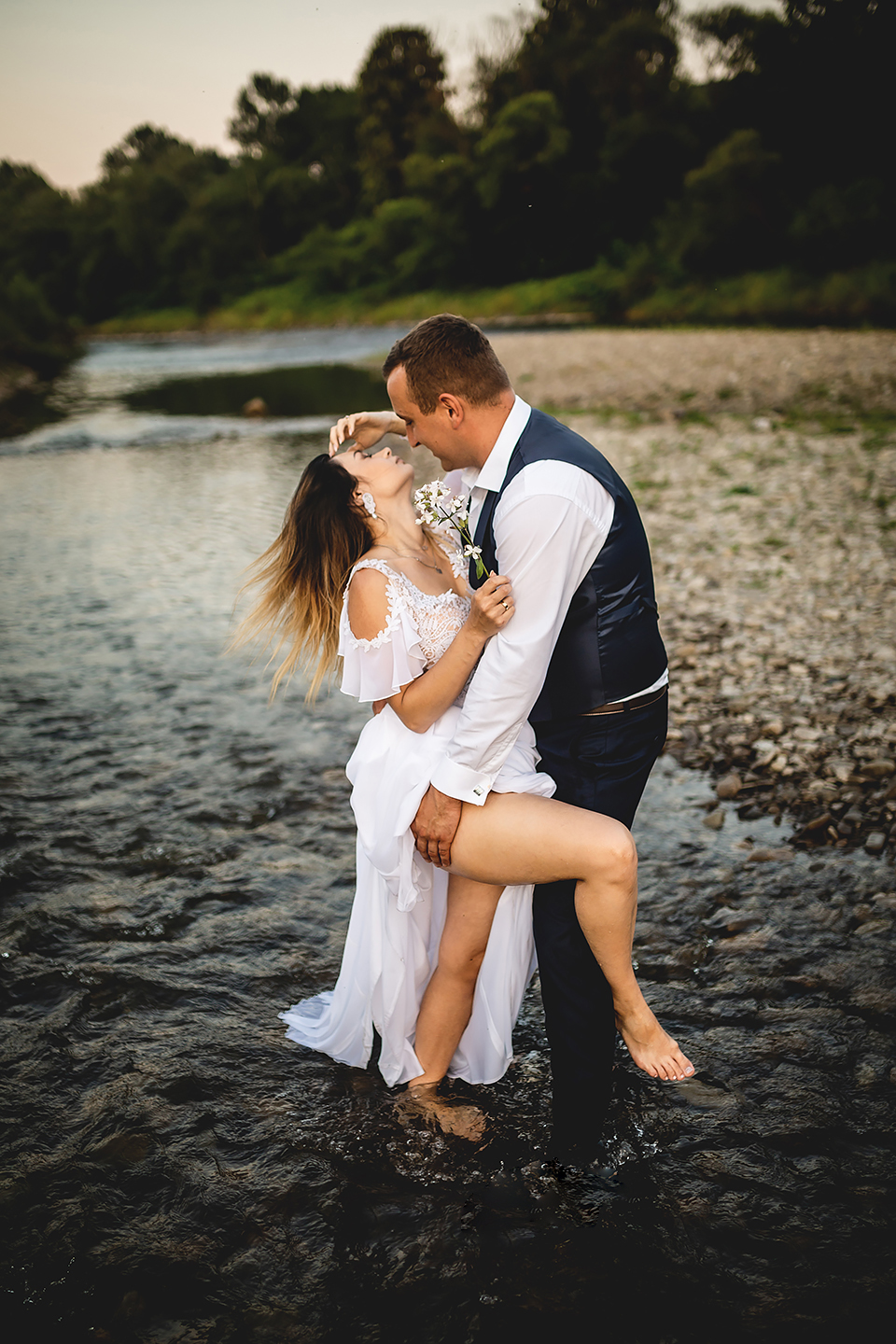 34 stopnie to niekoniecznie dobra temperatura do wykonania sesji ślubnej, więc trzeba sobie jakoś radzić. Szybka decyzja by przed słońcem schować się w stodole, a wieczorem ochłodzić się w górskiej rzece 🙂 To był strzał w dziesiątkę. Dzięki Asi i Dominikowi stylizacja sesji i atmosfera była podobnie gorąca jak ta na zewnątrz 🙂