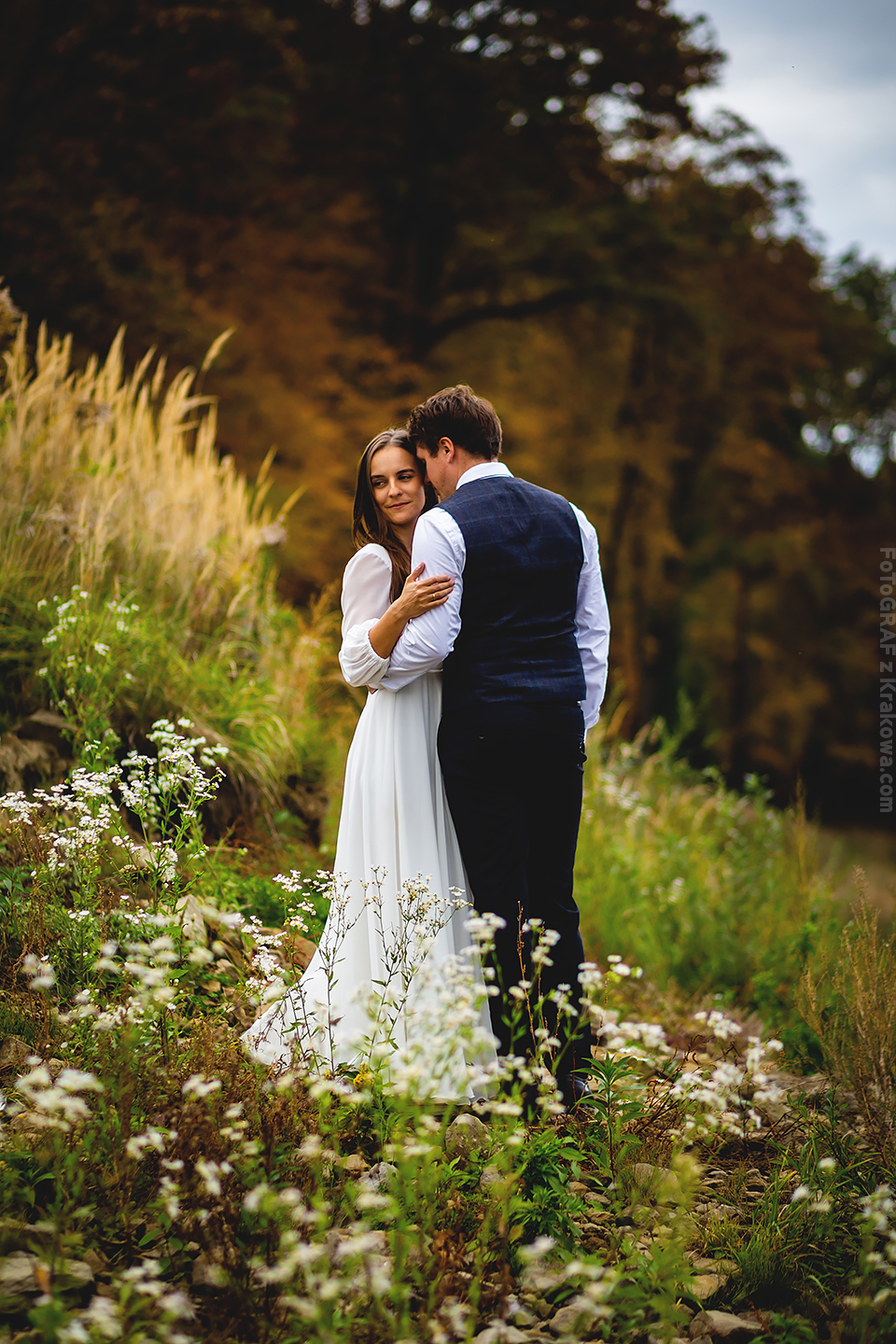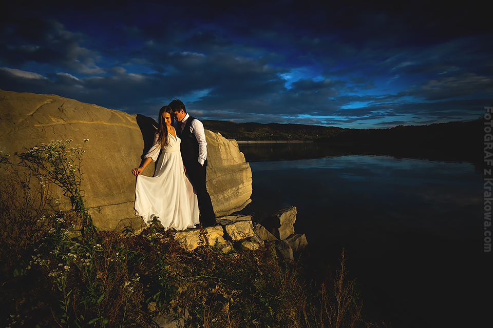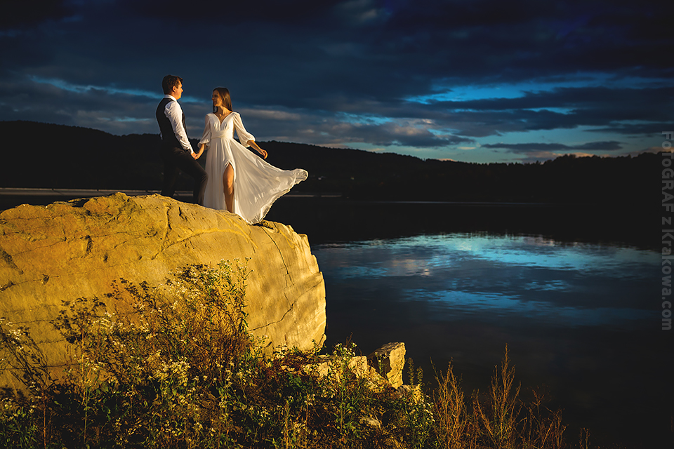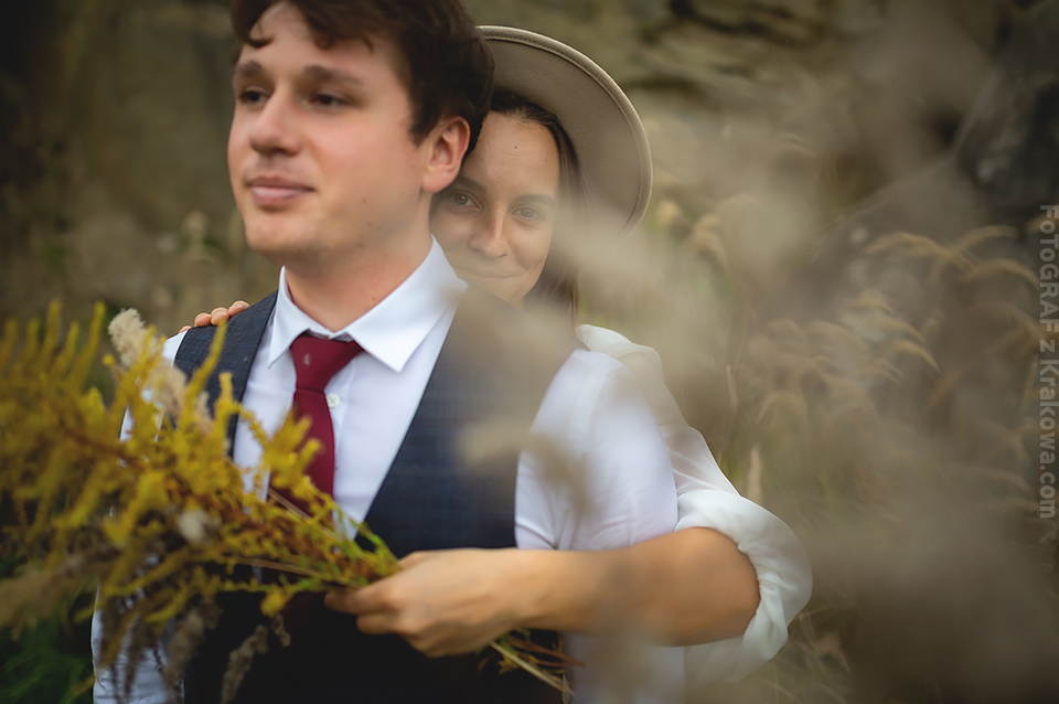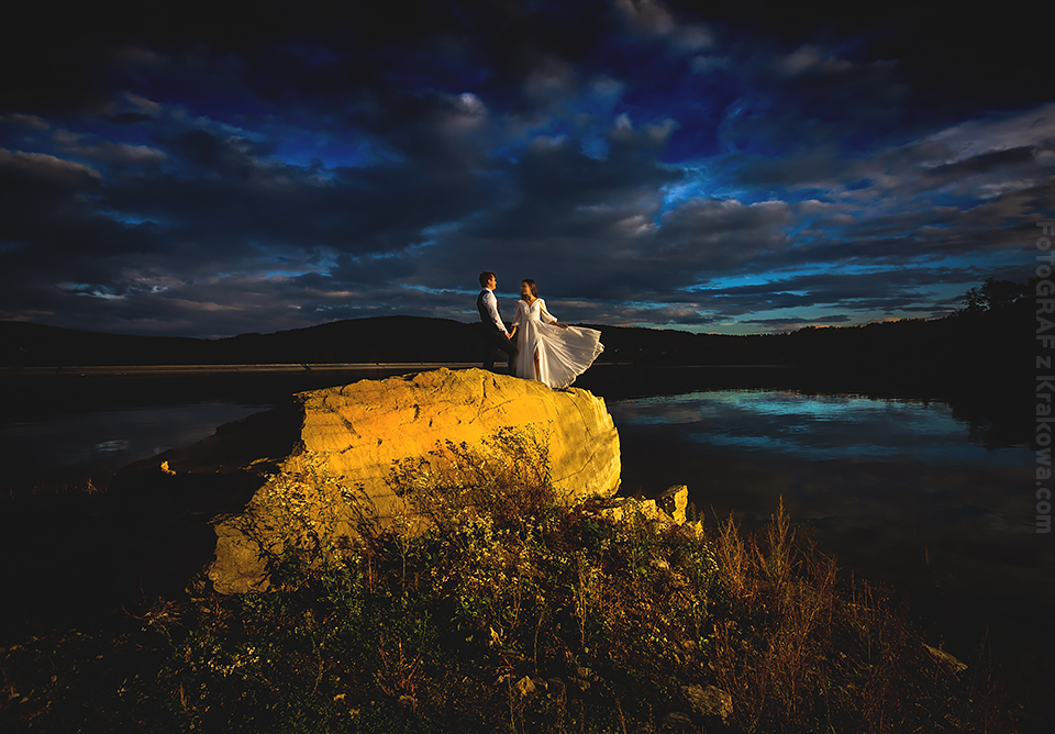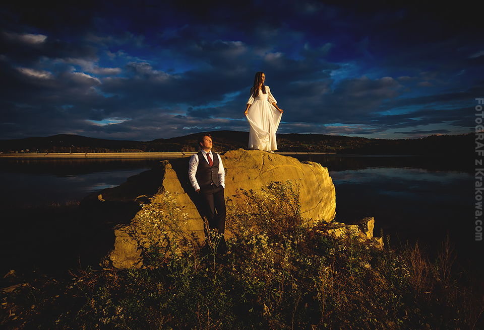 Jesienny okres ma to do siebie, że każde miejsce niezależnie od światła wygląda malarsko, bardziej kontrastowo, mimo chłodu również wygląda cieplej… zwłaszcza gdy rozpali się ognisko;) Z Agą i Łukaszem od początku wiedzieliśmy że plener będzie w skałach. Przez myśl przeszła również pałacowa tematyka, ale gdy wspinacz fotograf ma przed sobą parę również wspinaczy – nie pozostaje nic innego jak pojechać tylko w skały ! Zaproponowałem miejsce nad jeziorem, bardzo urozmaicone jeśli chodzi o kadry. Było dość pochmurno, jednak jak zobaczycie na zdjęciach poniżej – przez chwilę mieliśmy niesamowite światło 🙂
